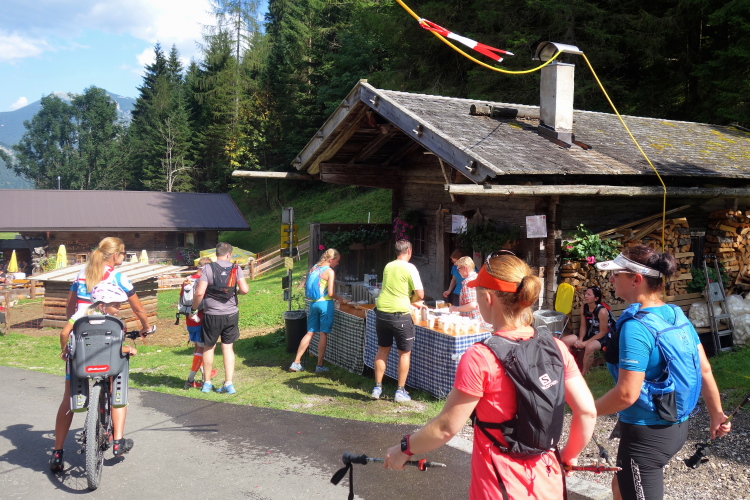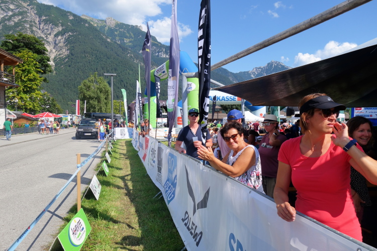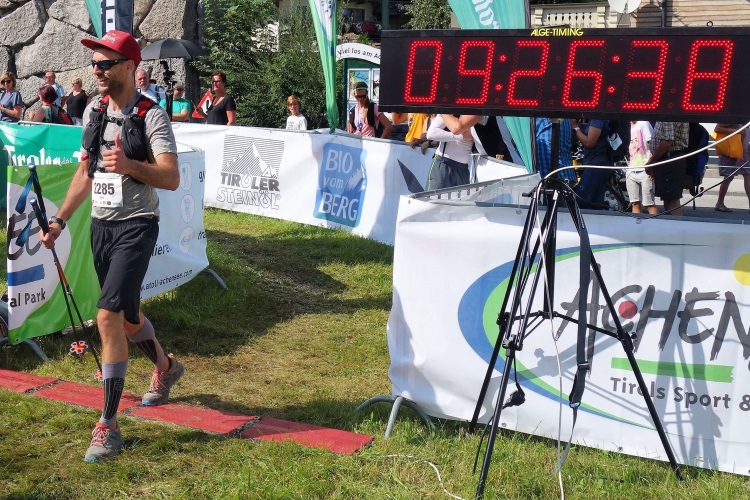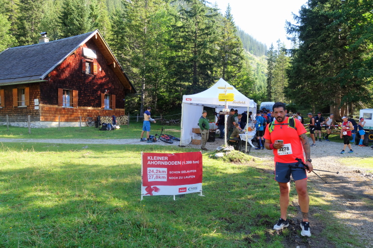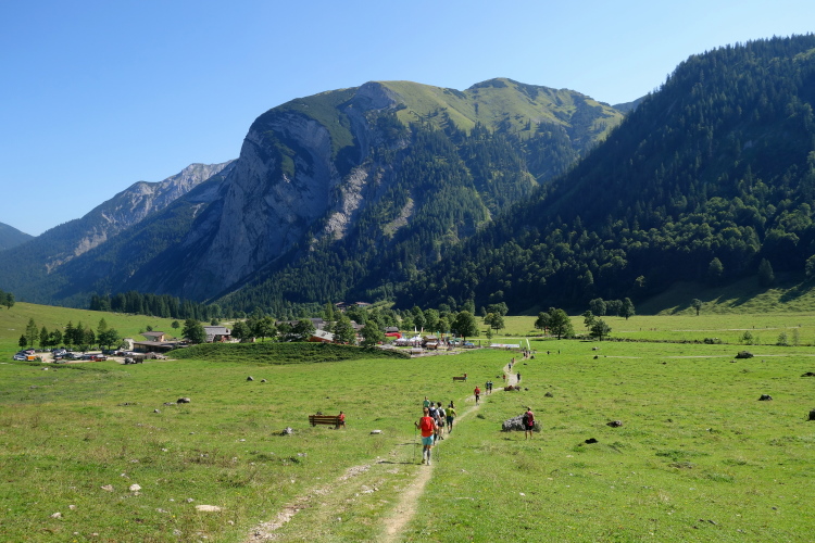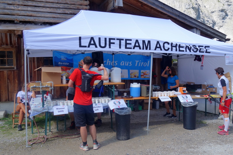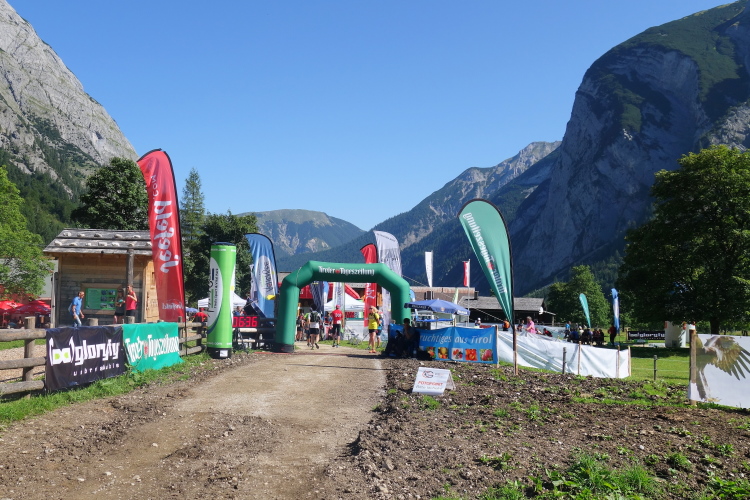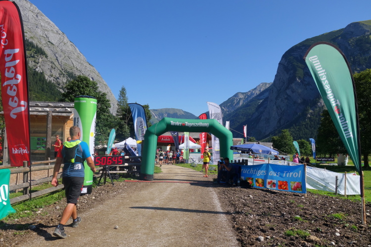 Der Abstieg zur Engalm (1.227 m) zieht sich. Man kann es nicht so richtig abwärts laufen lassen, dazu ist das Gelände zu schwierig. Aber nach etwas mehr als fünf Stunden laufe ich durch den Bogen an der Engalm. Hier ist bei Km 35 Schluss für einige Läufer und Marschierer. Für letztere wird auch eine gesonderte Ergebnisliste geführt. Die Engalm ist das größte Almdorf Tirols und größte Melkalm des Landes. Die frische Milch wird direkt zu Butter und Käse verarbeitet und im Bauernladen angeboten. Die Eng hat viel ihrer Ursprünglichkeit bewahren können. Auch hier stehen viele schöne Ahornbäume.