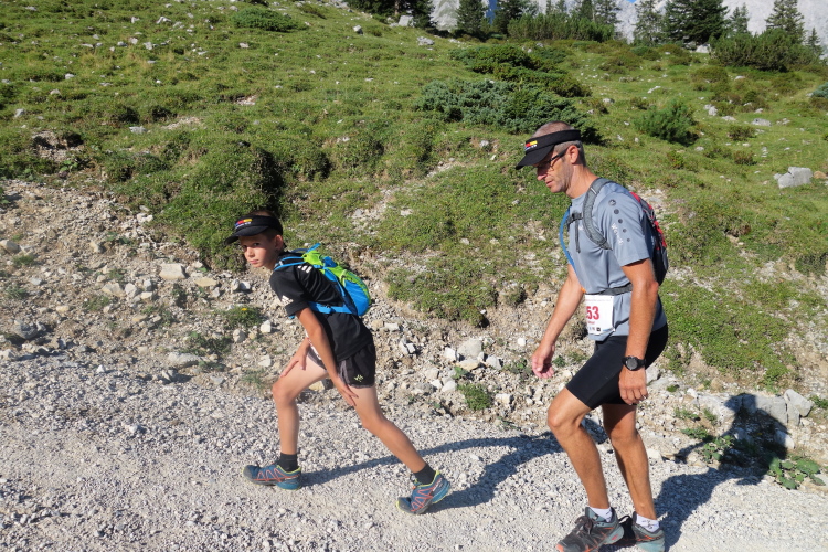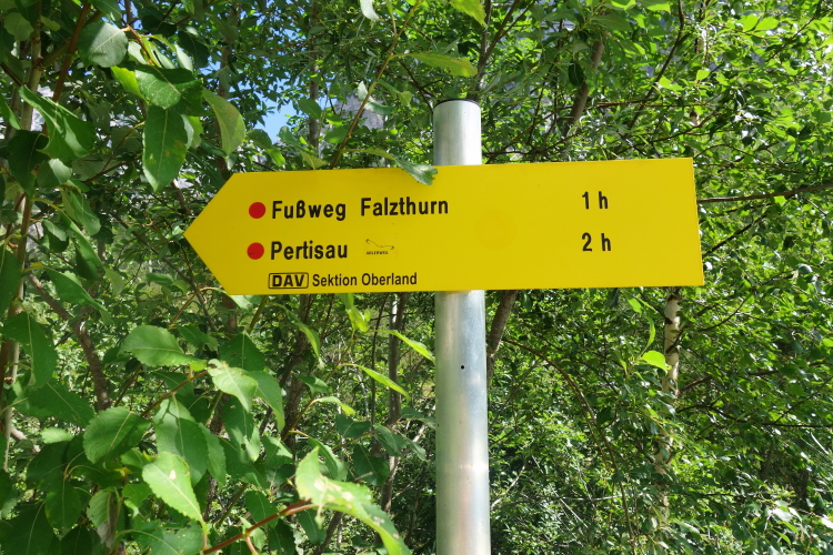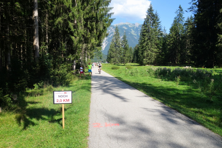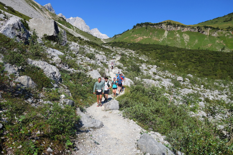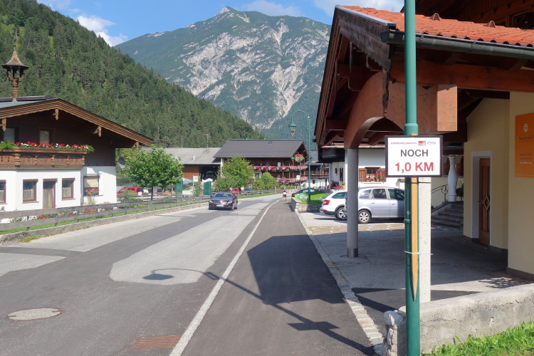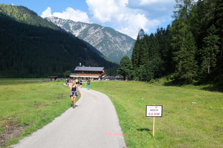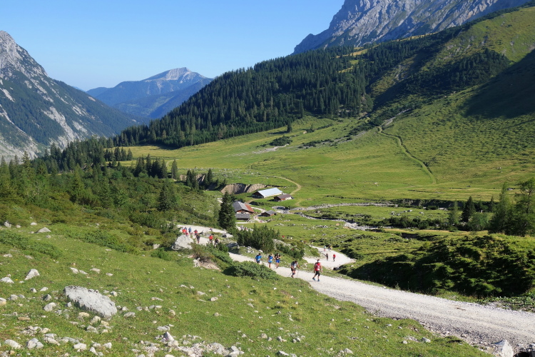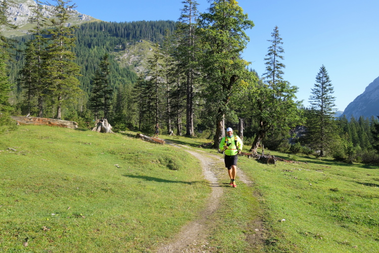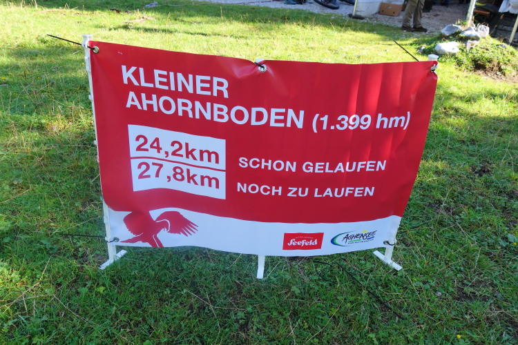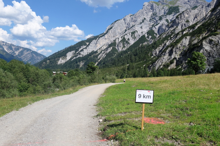 Beim Abwärtslaufen überhole ich viele Läufer in Richtung Kleiner Ahornboden (1.399 m). Wie der Name vermuten lässt, stehen hier viele der selten gewordenen Bergahornbäume. Auf Hinweisschildern kann man die gelaufene Strecke ablesen, ebenso die noch bevorstehenden Kilometer. Wir sind schon fast bei der Hälfte.