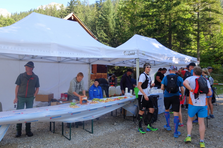Es geht zu Beginn ordentlich bergauf, dann aber wird es moderater mit der Steigung. Wie immer teile ich mir die Strecke in Etappen ein, meine Zwischenziele sind die VS. Die erste erwartet uns nach 9,6 Km am Schafstallboden auf 1.173 m Höhe. Bis hierhin sind es vom Start in Scharnitz auf 967 m gut 200 Hm aufwärts. Und auf diesen 200 Hm muss ich ständig immer wieder kleine Zwischensprints machen um an langsamen Marschierern vorbei zu kommen. Die Körner werden mir am Ende fehlen denke ich – und werde Recht behalten.