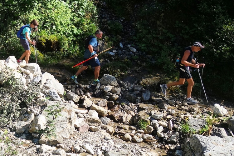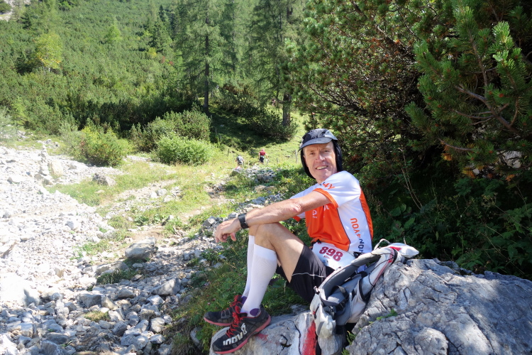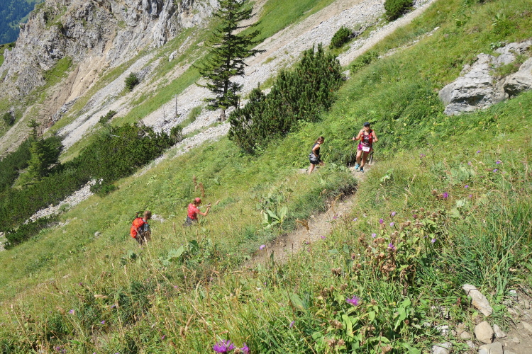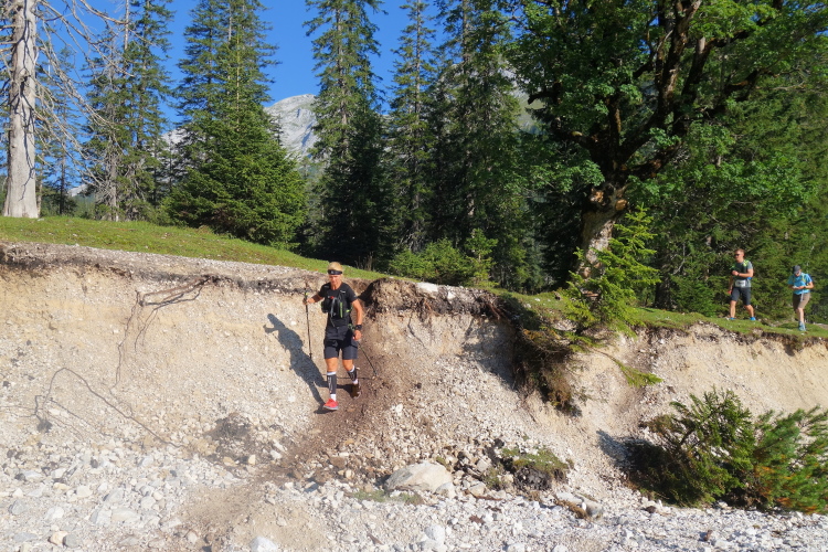 Auf dem Adlerweg ist Obacht geboten. Das ist schon ein anspruchsvolleres Laufen als auf den breiten Forstpisten. Ich genieße den Schatten. Ab dem Hohljoch dürfen wir auf anspruchsvollen Trails zur Engalm laufen. An zahllosen Bächen kühle ich meinen Kopf. Ich bin kein Hitzeläufer. Mein Leiden beginnt.