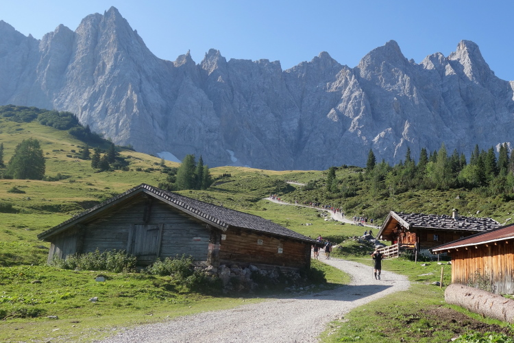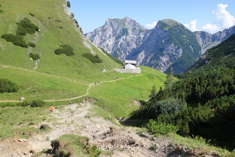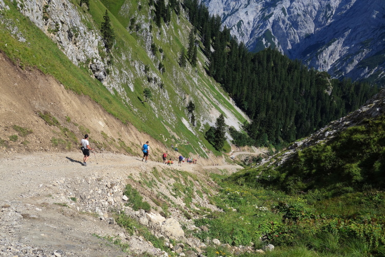 Mich fasziniert besonders der Blick von der Ladizalm zu den Wänden des Karwendelgebirges. Besonders die 900 m hohen, senkrechten Lalidererwände haben es mir angetan. Durch die Nordwände führen einige sehr schwierige Kletterrouten. Ist mir zu schwierig und ich bleibe beim Laufen. Der Aufstieg zur Falkenhütte ist schon schwierig genug. Und dazu brennt mittlerweile die Sonne richtig von oben und heizt uns ein.
