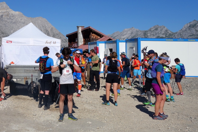 Es ist nicht besonders frisch. Meine Ärmlinge werde ich wohl bald ausziehen und im Trinkrucksack verstauen können. Uns erwartet ein schöner Tag mit Sonnenschein und 28 Grad. Regen und Gewitter werden erst für den Nachmittag prognostiziert. Schaun wir mal wie es wird. Ich habe meinen Trinkrucksack wieder mit 2 L Apfelsaftmischung gefüllt, dazu ist wie stets im Gebirge eine Windschutzjacke im Gepäck. Eine Pflichtausrüstung schreibt der Veranstalter beim Karwendel nicht vor, aber Wetterschutz im Gebirge ist für mich eine Selbstverständlichkeit.