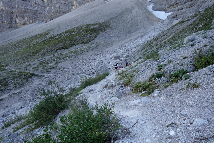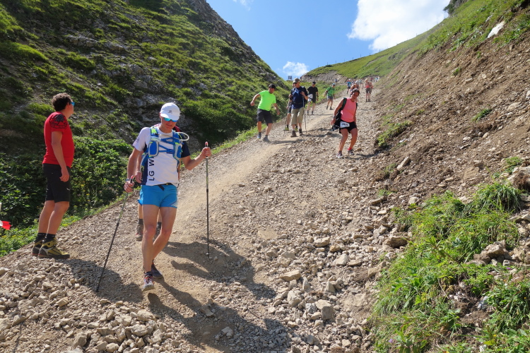 Ich muss also von der Binsalm noch weitere 400 m hinauf. Zuerst auf breitem Schotterweg, dann in unzähligen Serpentinen. Und die Steilheit nimmt immer mehr zu. Dazu ist weit und breit kein Bach zur Kühlung da. Ich muss mehrfach eine Pause einlegen. Normalerweise machen mir 400 Hm nichts aus, aber unter diesen Bedingungen heute will ich kein Risiko eingehen. Ich muss unzählige Läufer an mir vorbei ziehen lassen, komme aber trotz Pausen immer weiter nach oben. Und endlich ist der Binssattel auch für mich erreicht.