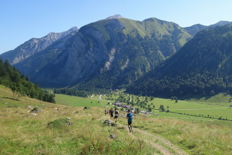 Auf gut zu laufendem Weg geht es ab hier durch das breite Tal weiter abwärts, abwechselnd laufend und gehend dem Ziel in Pertisau näher. An der Falzturn Alm (1.098 m) greife ich wieder nur ein Getränk ab und laufe rasch weiter.