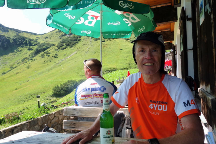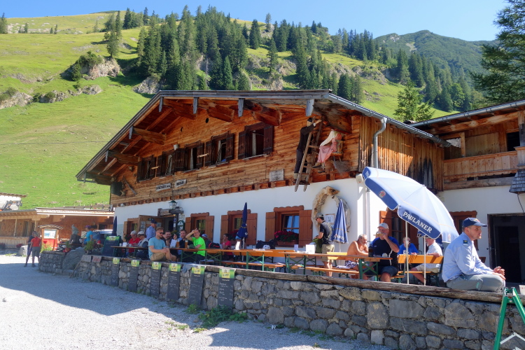 Ich setze mich in den Schatten und schaue mir das nächste Ziel unter uns an. Es ist der Gramai Hochleger (1.856 m). Der Abstieg ist ähnlich anspruchsvoll wie hinunter zur Eng. Die VS lasse ich frevelhaft unbeachtet. Mein Magen möchte nichts essen. Mir ist nach einem Radler zumute und das hole ich mir im Gastraum und setze mich damit in den Schatten.