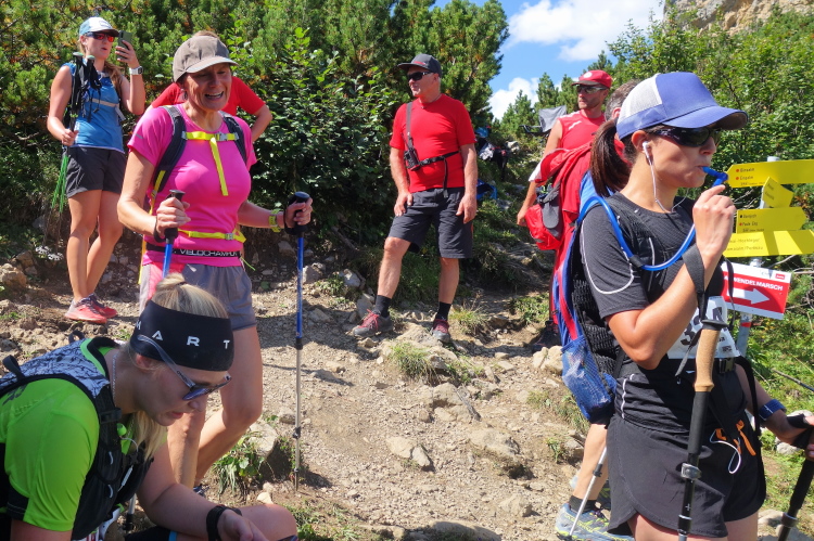 Ich greife mir einen Holundersaft und Obst und biege rechts ab zum nächsten langen Aufstieg, voll in der Sonne. Ich merke, wie die Kräfte schwinden. Ich schaffe es gerade noch langsamen Schrittes ohne Anzuhalten bis zur Binsalm (1.502 m). Hier ist wieder eine VS. Ein Joghurt im Schatten genossen lässt mich hoffen, den weiteren Anstieg zu meistern. Was ich aber nicht weiß, es erwartet uns der härteste und längste Aufstieg des Tages zum höchsten Punkt der Strecke, dem Binssattel (Gramaisattel) auf 1.903 m.