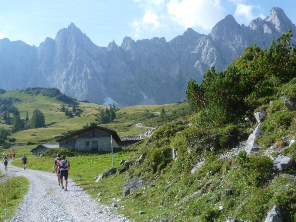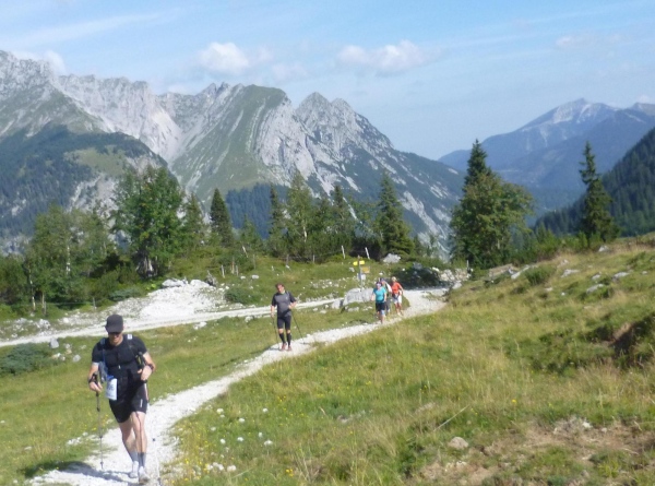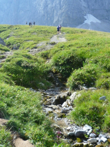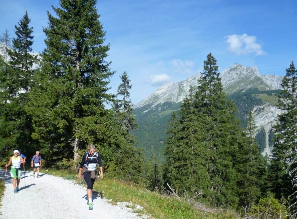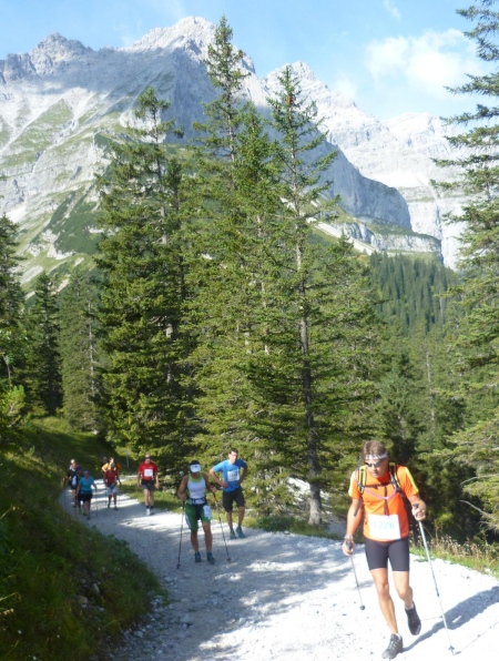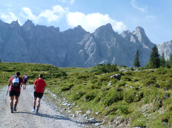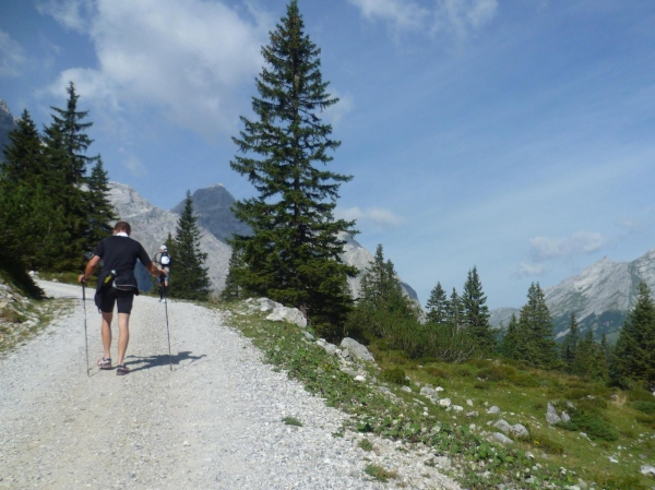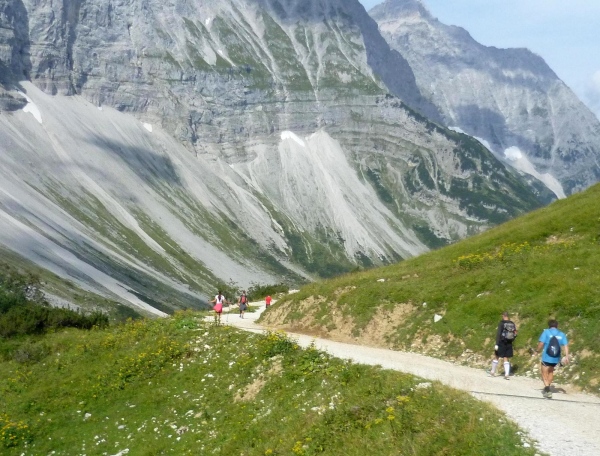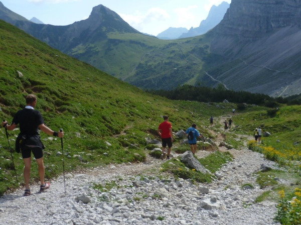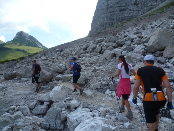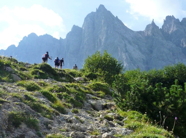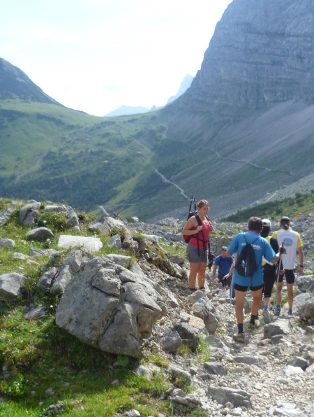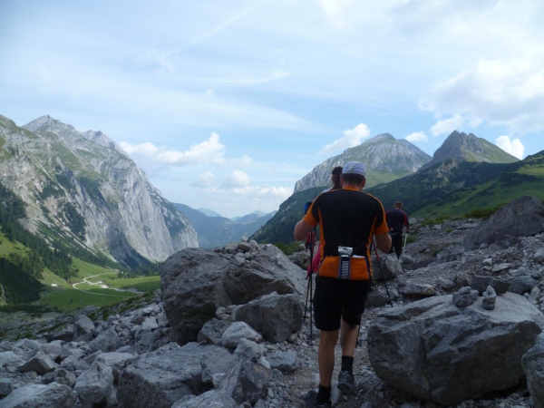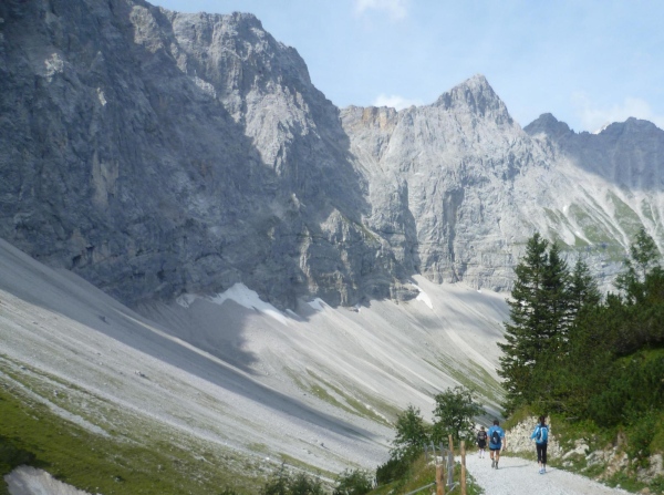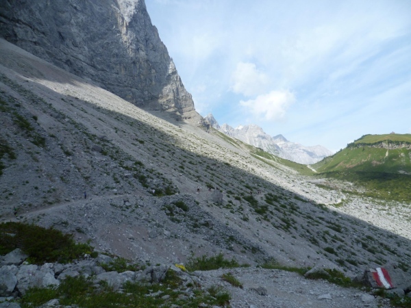 Weiter geht es jetzt bergab. Zunächst laufen wir direkt auf die imposante Laliderer Felswand zu. Am Spielissjoch verlassen wir die Hauptstrecke und gehen durch ein Weidegatter nach links. Der Trail könnte genauso das ausgetrocknete Bett eines Gebirgsbachs sein. Genauso steinig und zufällig verläuft der Weg. Dann führt die Strecke rechts am Hang entlang. Wir steigen über große Felsbrocken; hier haben die Wanderer mit ihrer Ausrüstung eindeutig Vorteile. Diese Felsbrocken sind Zeugen von Felsstürzen, die sich weiter oben ereignet haben. In dem hier vorherrschenden Kalksteingebirge gab es solche Felsstürze selbst in der Neuzeit.