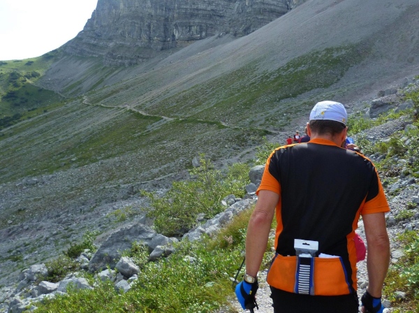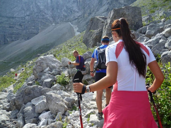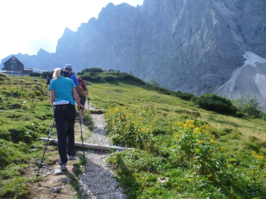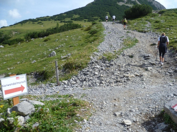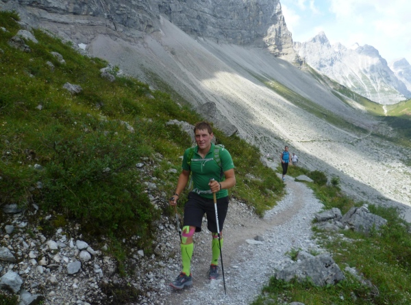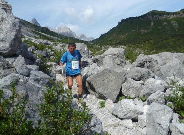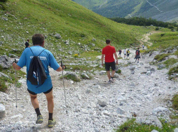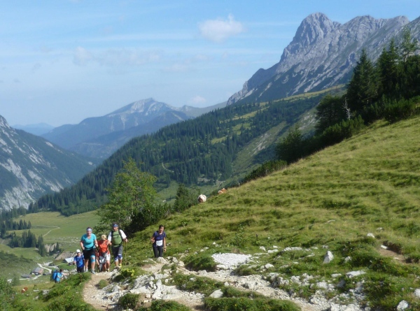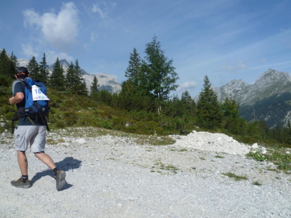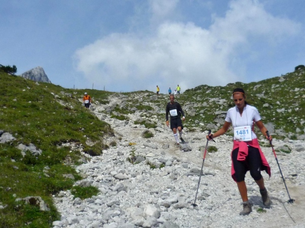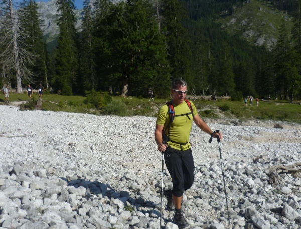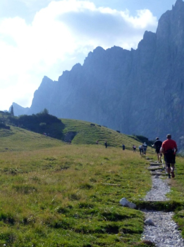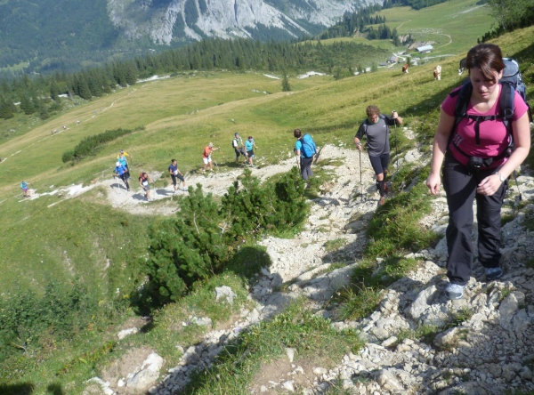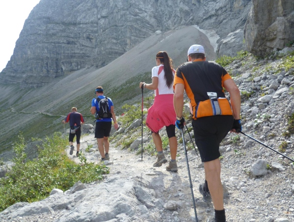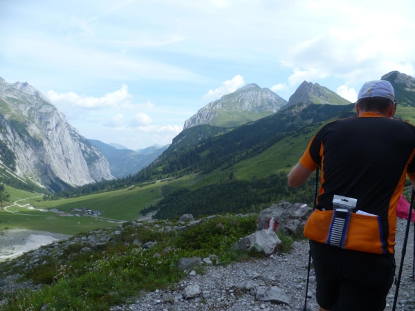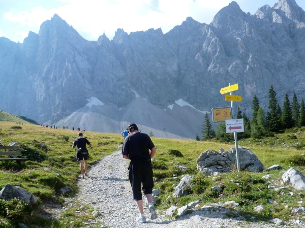 Weiter geht es jetzt bergab. Zunächst laufen wir direkt auf die imposante Laliderer Felswand zu. Am Spielissjoch verlassen wir die Hauptstrecke und gehen durch ein Weidegatter nach links. Der Trail könnte genauso das ausgetrocknete Bett eines Gebirgsbachs sein. Genauso steinig und zufällig verläuft der Weg. Dann führt die Strecke rechts am Hang entlang. Wir steigen über große Felsbrocken; hier haben die Wanderer mit ihrer Ausrüstung eindeutig Vorteile. Diese Felsbrocken sind Zeugen von Felsstürzen, die sich weiter oben ereignet haben. In dem hier vorherrschenden Kalksteingebirge gab es solche Felsstürze selbst in der Neuzeit.
