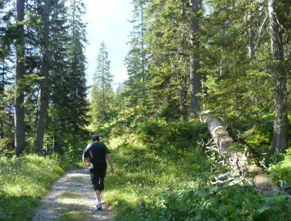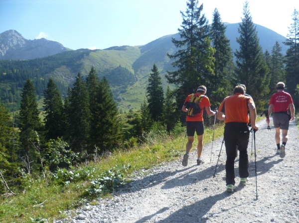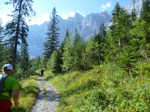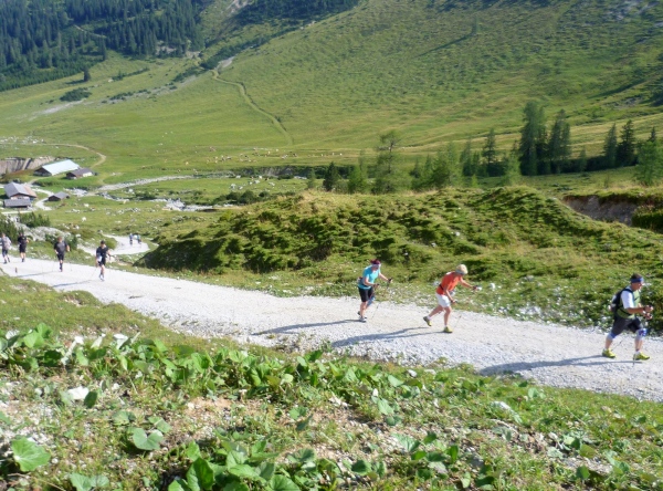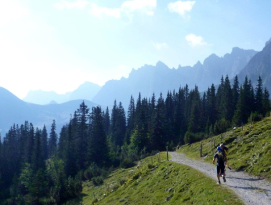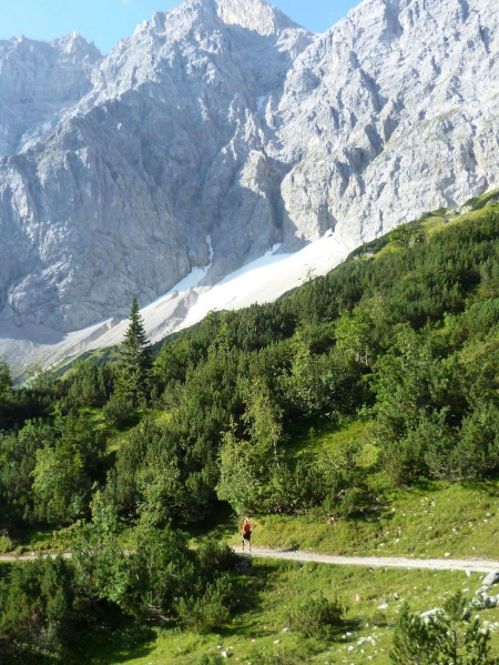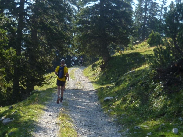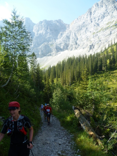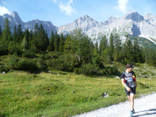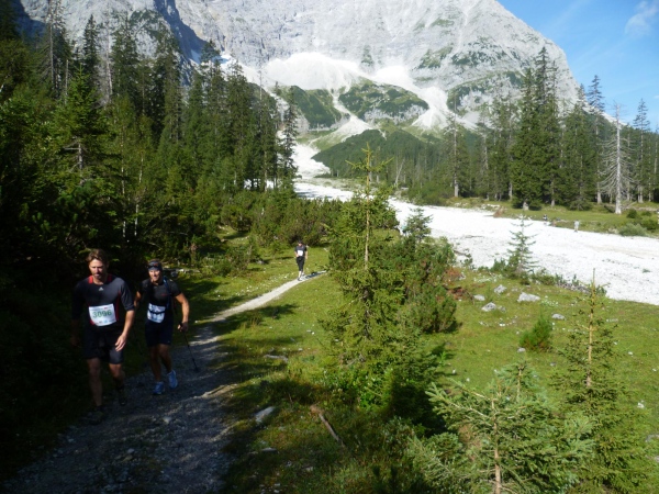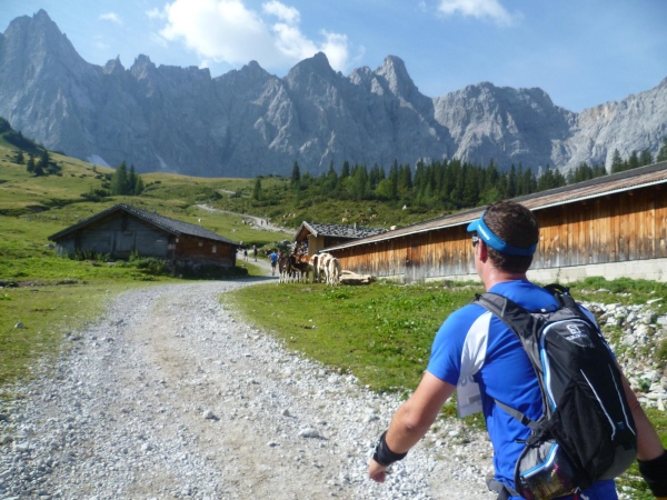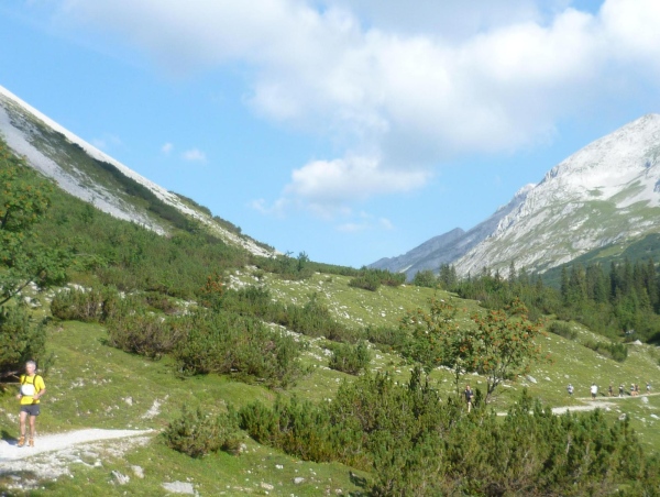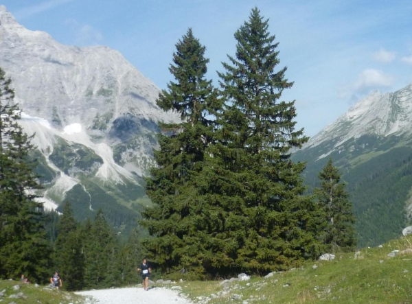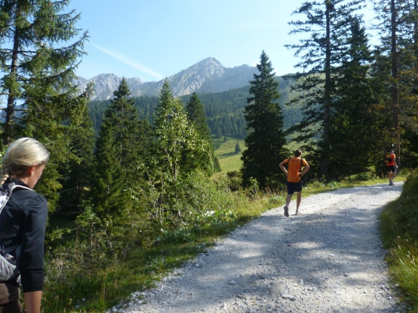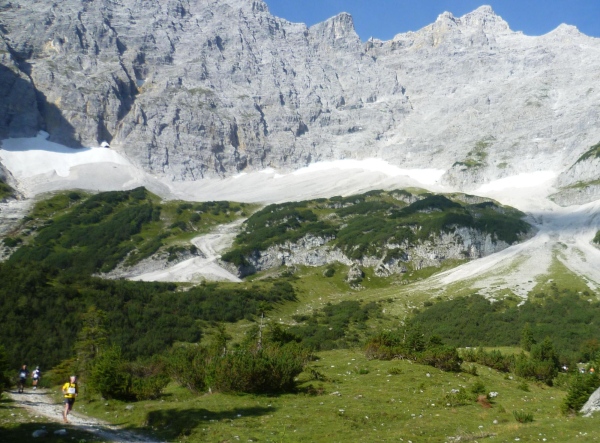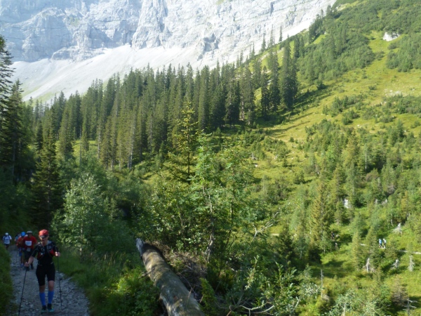 Eigentlich ist die Landschaft viel zu schön, um zu rennen. Der Nadelwald ist so licht, dass sich immer neue Aussichten bieten. Es lohnt sich aber auch einmal kurz stehen zu bleiben und zurück zu blicken. Das Massiv von Hochalmkreuz, Schlauchkarkopf und Hochjöchel ist zum Greifen nah. Liegt da nicht Schnee oberhalb des riesigen Geröllfeldes, an dessen Fuß wir entlang laufen? Über allem hängt das Gebimmel von Kuhglocken.