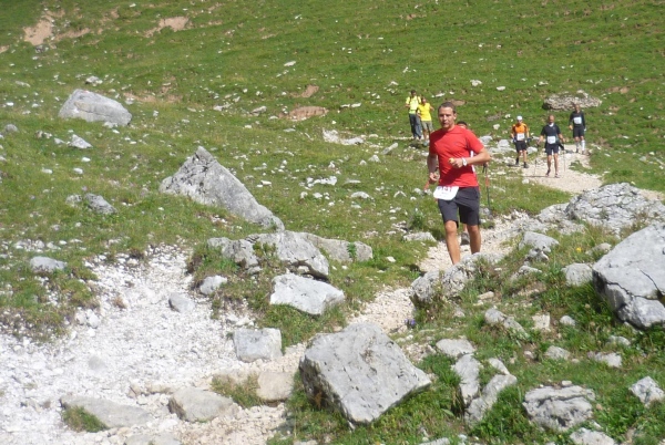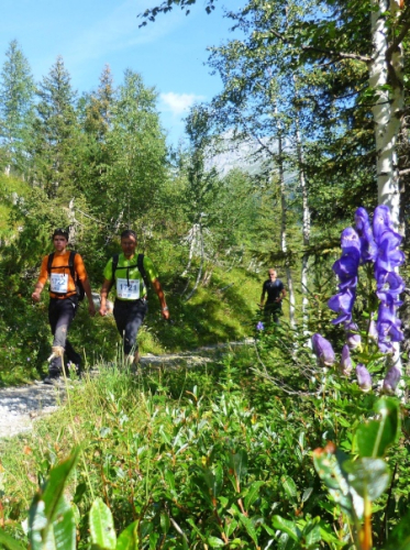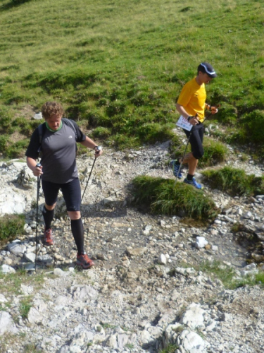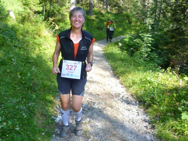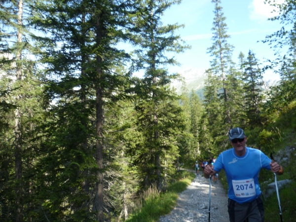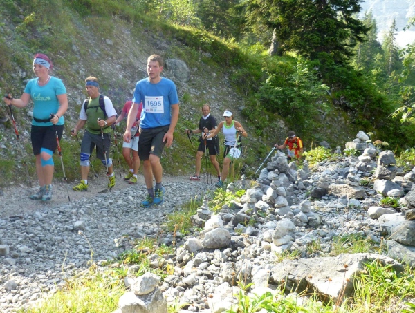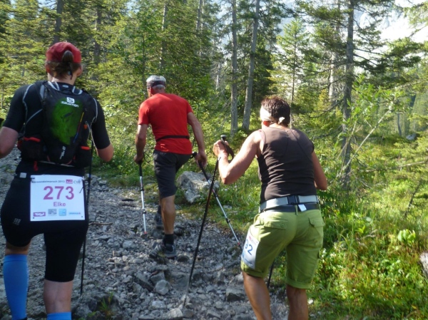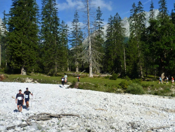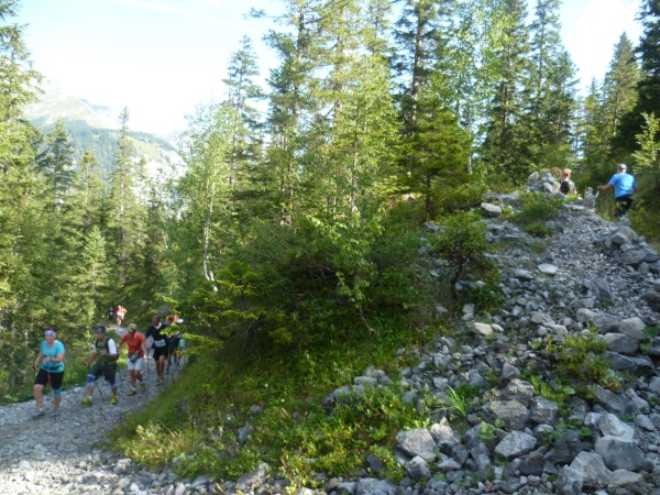 Durch die großen Steine ist es sehr holprig und so versuchen alle eher am Rand zu laufen. Ich kann sowieso nicht so schnell – zu viel gegessen! Mit Erreichen der Baumgrenze wird es deutlich unwegsamer. Einmal knicke ich sogar um. Es ist nicht weiter schlimm, mahnt mich aber zur Vorsicht. Noch langsamer suche ich nach dem besten Weg. Ich überhole eine humpelnde Läuferin, die ebenfalls umgeknickt ist.