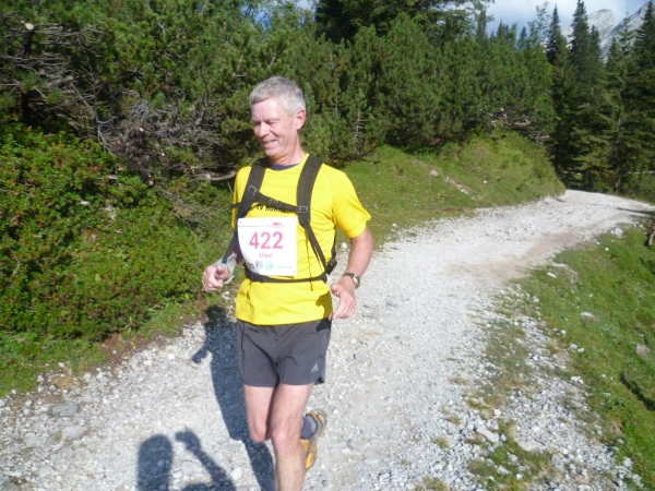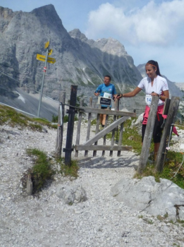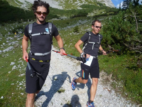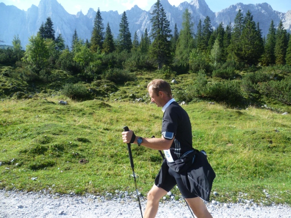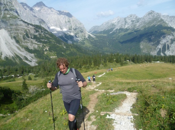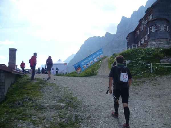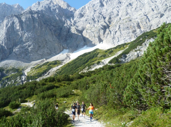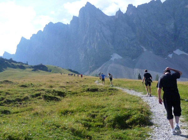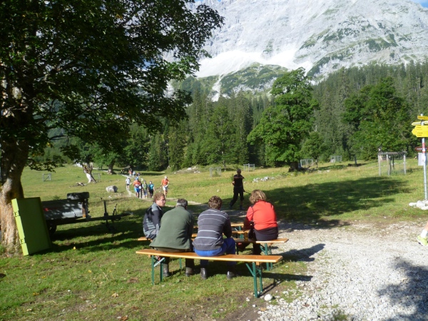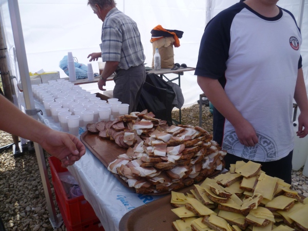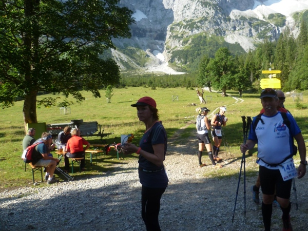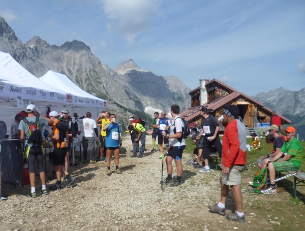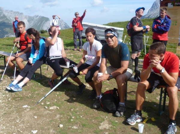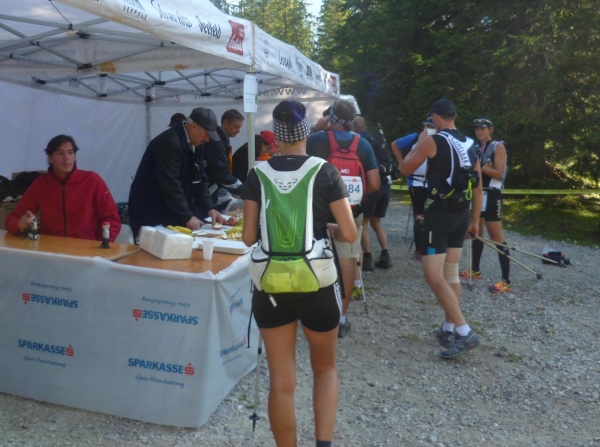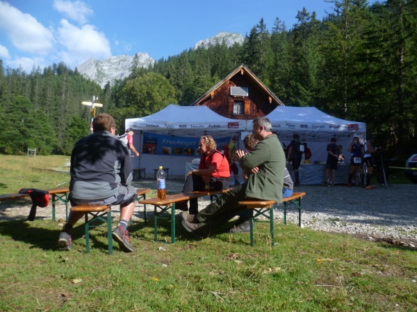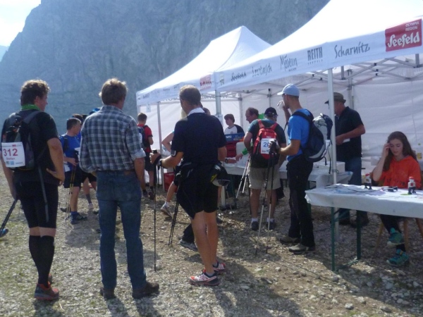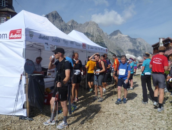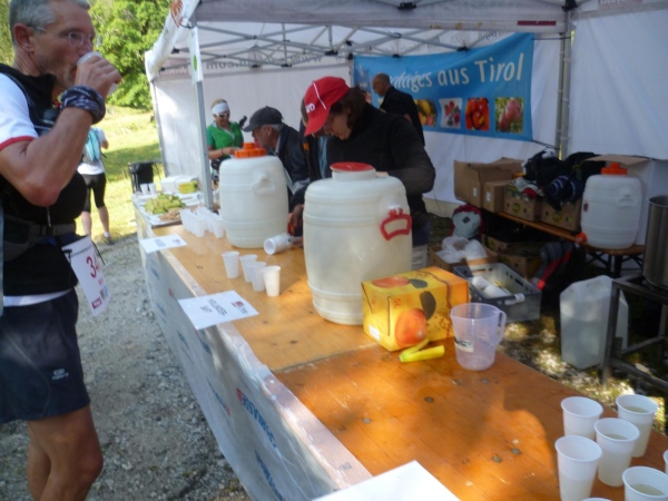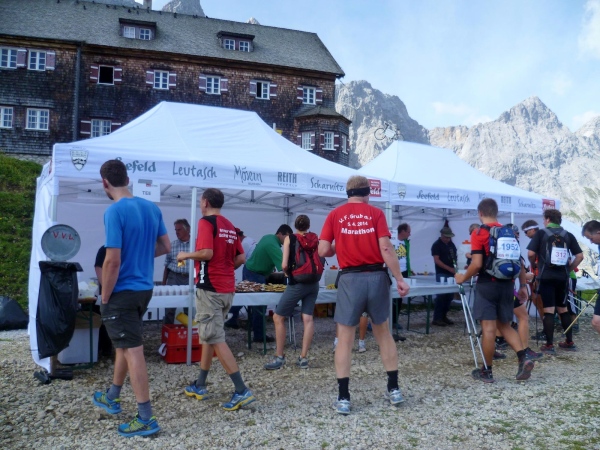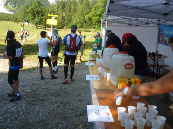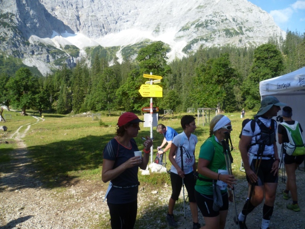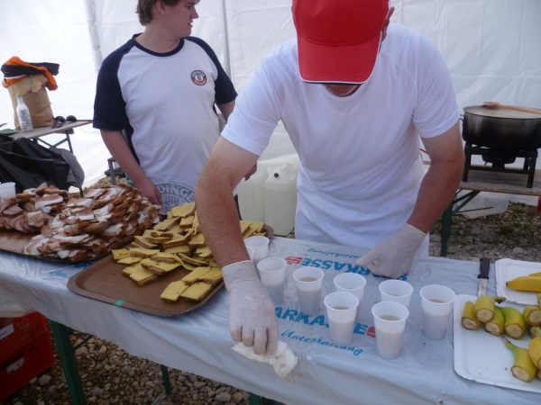 Die Verpflegungszelte sind auf der anderen Seite Richtung Laliderer Tal aufgebaut. Zu Füßen der bekannten Laliderer Kletterwände zu speisen hat etwas. Man kann hier nur von speisen reden: als Vorspeise gibt es eine Hafersuppe mit Gemüseeinlage. Als Hauptgang werden Schinken und Salami auf Tiroler Bauernbrot gereicht. Als Dessert kann eine Banane gewählt werden. Zum Abschluss noch Käse - kein Problem. Die bewährten Getränke gibt es selbstverständlich dazu.