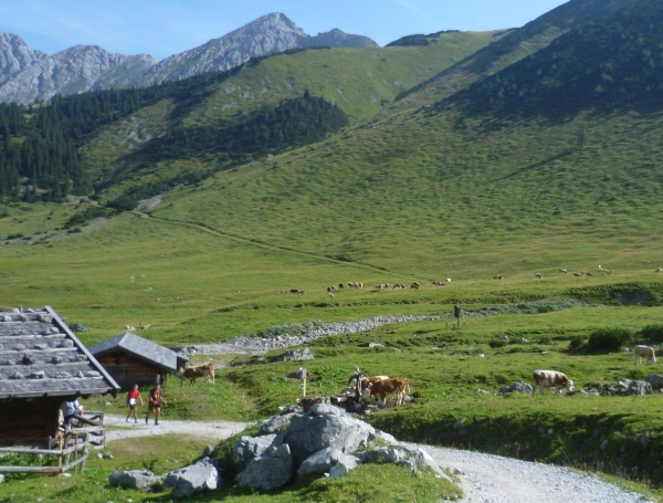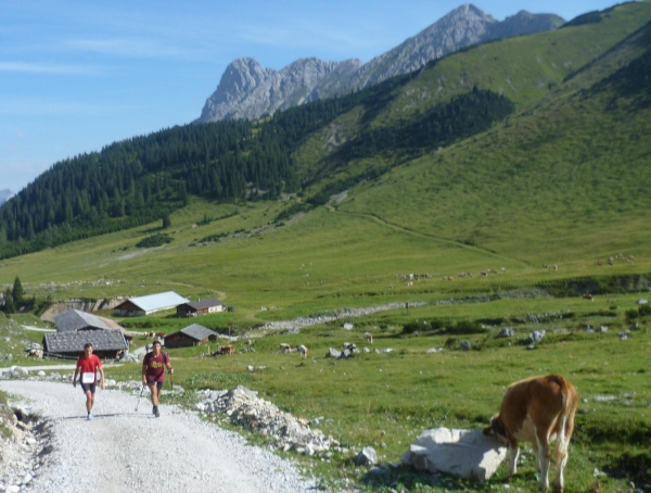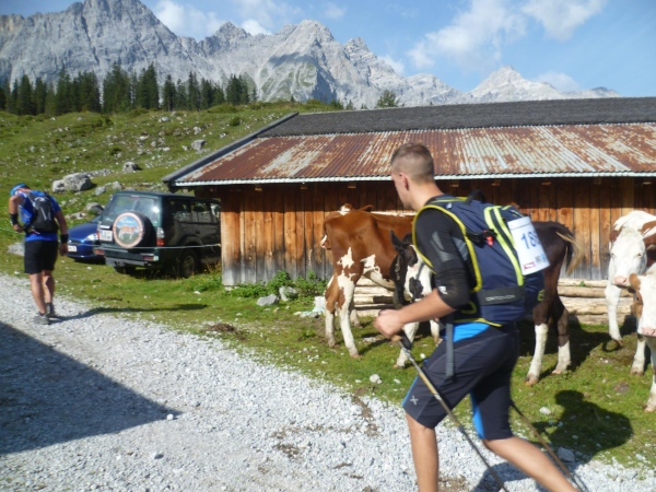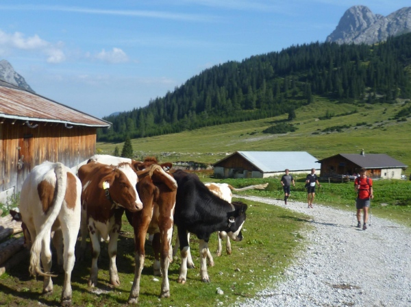 Die Baumgrenze wird überschritten, die Ladizalm liegt vor uns. Glockengeläut liegt in der Luft und jetzt habe ich auch wieder Hunger. Aber hier ist keine Labestation vorgesehen. Ein Schild kündigt die Falkenhütte in 30 Minuten an. Also „labe“ ich mich vorerst an der schönen Landschaft. Vor mir im steilen Hang liegen Hütten, fast wie ein kleines Dorf. Einige sind bewohnt. Hier ist ein Paradies für Mensch und Kuh. Vor allem, wenn zu den Naturschönheiten heute noch sportliche Höchstleistungen geboten werden. Und so haben sich Bewohner und Kühe versammelt, um die Vorbeikommenden neugierig zu beäugen.