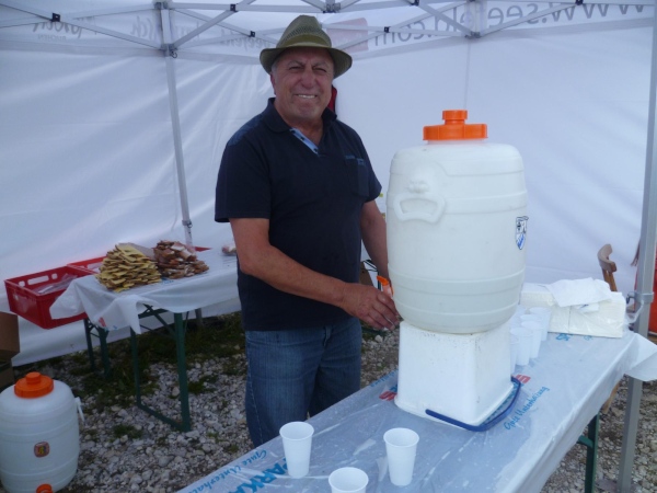 Als Getränk gibt es wieder Hollundersaft, Wasser und Tee. Während ich mich gemütlich stärke, habe ich ständig „Vitamine, Vitamine, Vitamine“ im Ohr. Ich suche nach der Ursache dieser Stimme. Ganz rechts unter dem letzten Schirm steht ein Helfer und bietet lautstark, mit einem übergroßen Messer bewaffnet, Apfel- und Bananenstücke an. Aufgrund der anderen Leckereien findet er nur wenig Abnehmer.