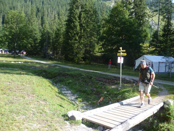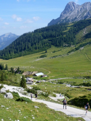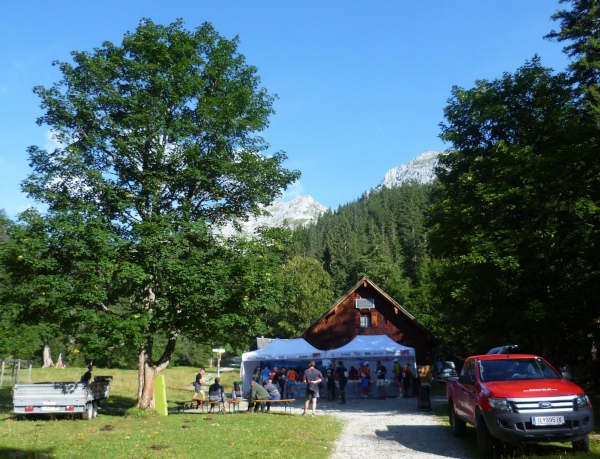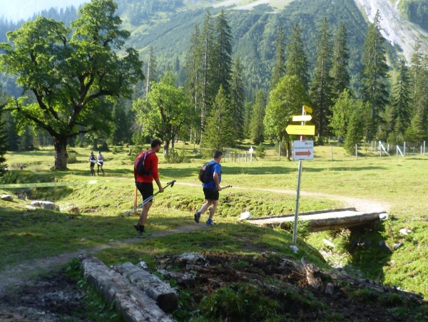 Immer weiter geht es hinunter. Ich halte Ausschau nach den ersten Ahornbäumen, die unser nächstes Ziel, den kleinen Ahornboden, anzeigen. Aber erst als schon die Almwiese in Sicht kommt, kann ich die Ahornriesen eindeutig erkennen. Hier stehen auch schon die Verpflegungszelte.