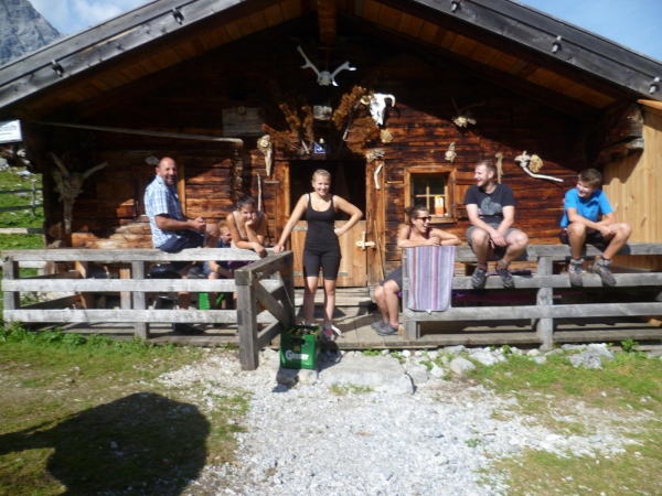 Und dann liegt sie tatsächlich vor uns: die Falkenhütte. Noch ein letzter steiler Anstieg und wir sind oben (1848 m). Das stattliche Schutzhaus des Alpenvereins ist für Bergsteiger ein ausgezeichneter Stützpunkt für mehrtägige Touren, beispielsweise längeren Karwendel-Durchquerungen. Darüber hinaus können auch Tagesgäste die Wegstrecke von der Eng zur Hütte bewältigen und nach einer Rast wieder am selben Tag absteigen. Vorrangig ist die Falkenhütte jedoch ein wichtiger Stützpunkt am Fernwanderweg Via Alpina, welcher im Karwendel von Scharnitz zum Achensee führt. Fritz Kostenzer und seine Familie betreuen im Sommer nun schon in zweiter Generation die 1922 erbaute Hütte. Mit seinen 28 Betten und 120 Lagern bietet es auch ausreichend Platz. Im Winter steht ein unverschlossener, beheizbarer Raum für Skitourengeher im Nebengebäude zur Verfügung. Ein Reparatur-Service für Fahrräder komplettiert das Angebot. Neuerdings gibt es sogar eine Akkuwechsel-Station für E-Bikes.