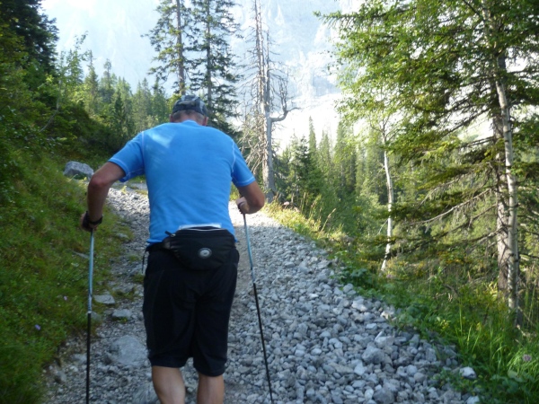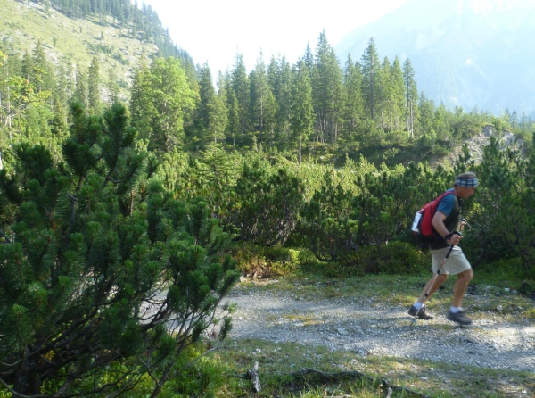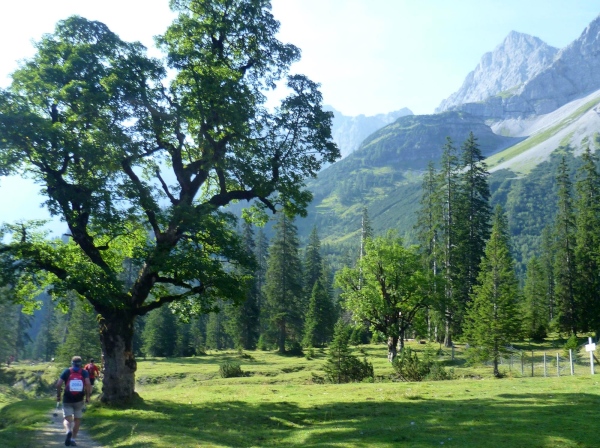 Ich kann unmöglich schon wieder etwas essen. Aber Trinken ist notwendig; mittlerweile ist es ganz schön warm geworden. Der Name „kleiner Ahornboden" dürfte von den alten Ahornbäumen herrühren, die hier wachsen. Es gibt noch den flächenmäßig größeren „Großen Ahornboden“ kurz vor der Eng. Die Schönheit des „kleinen“ steht dem „großen“ aber in nichts nach. Im Gegenteil: hierher kommen nur Besucher, die sich vorher auf den Berg hinauf „gekämpft" haben.