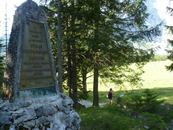 Am Denkmal des Karwendel-Entdeckers, Hermann von Barth, vorbei und über einen Steg geht es auf einem romantischen Singletrail weiter. Wir überqueren ein riesiges ausgetrocknetes Flussbett und setzen unseren Weg am gegenüberliegenden Ufer fort. Jetzt geht es wieder bergauf. Während der nächsten Kilometer haben wir ausgiebig Gelegenheit die Natur zu bewundern, die sich rechts und links des Weges ausbreitet. Obwohl wir uns im Wald befinden, grünt und blüht es. Je höher wir kommen, umso lichter stehen die Bäume. Großartige Ausblicke wechseln mit scheinbar nahen imposanten Felswänden.