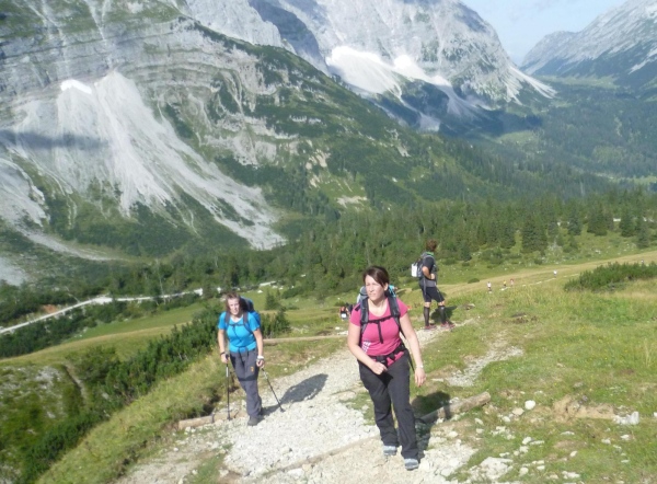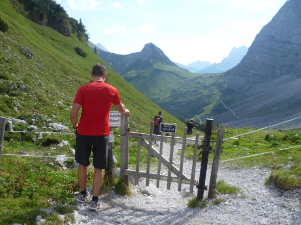 Der steile Weg hat den Vorteil, dass man schnell an Höhe gewinnt. Wobei Geschwindigkeit hier relativ ist. Aber es geht Schritt für Schritt hinauf. Vor uns türmt sich eine Wand aus Kühkarlspitze, nördlicher Sonnenspitze, Bockkarspitze und Laliderer Spitze, allesamt Zweieinhalbtausender. Wir biegen auf den Singletrail zur Falkenhütte ab. Noch kann man sie nur erahnen, aber die Richtung ist klar: nach oben. Hier ist Radfahren nicht erlaubt und ein Schild weist eindeutig darauf hin, dass der Wanderer auf dem Weg bleiben muss. Der Weg ist dafür professionell angelegt. Holzbohlen, als Treppen verbaut, erleichtern den steilen Anstieg. Irgendwann endet der Weg und man muss das letzte Stück kletternd zurücklegen. Das ist aber nicht weiter schlimm. Es macht sogar mehr Spaß, als das dauernde Steigen.