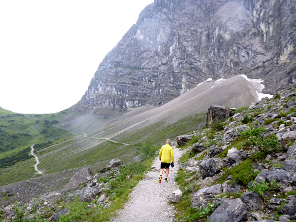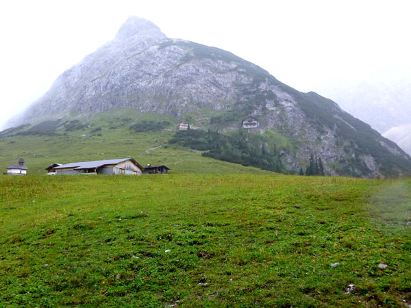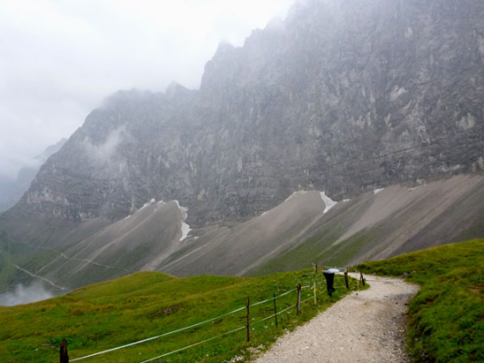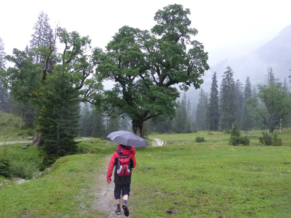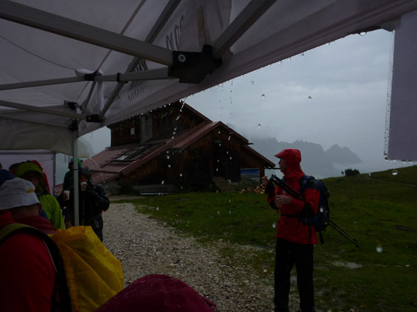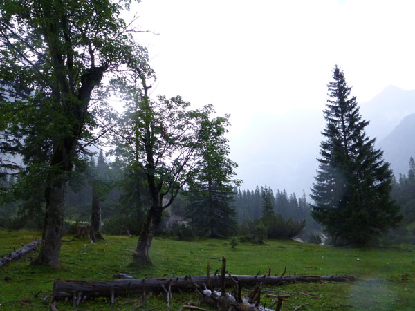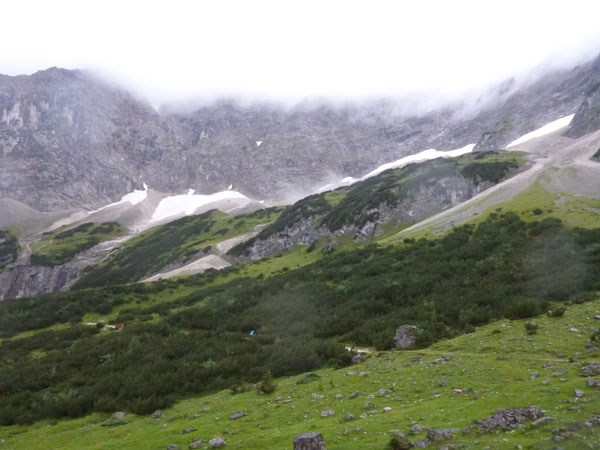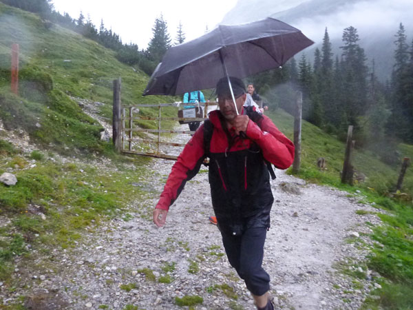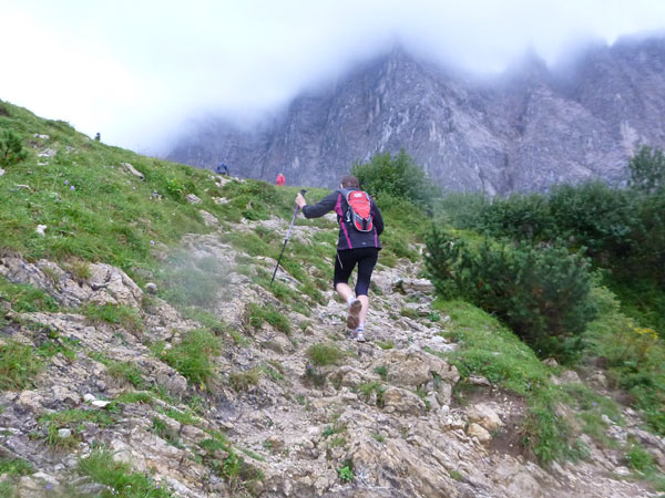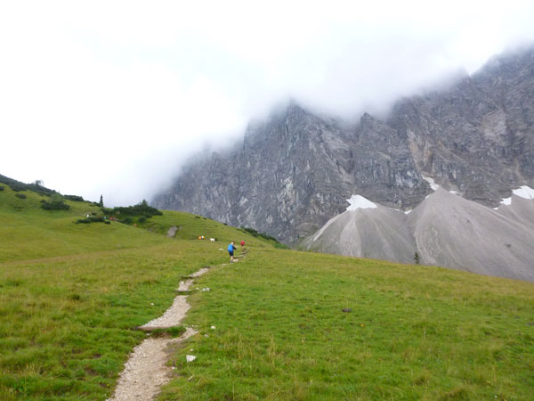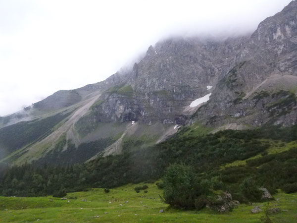 Bis zur Falkenhütte sind wieder 600 Höhenmeter fällig, die zweite Hälfte davon ab Ladizalm richtig steil. Dafür wird der Blick, je weiter es hoch geht, umso schöner auf die mächtigen Ladiderer Wände vor uns. Trotz vieler Wolken sind sie momentan gut zu sehen. 900 Meter wachsen sie fast senkrecht hoch bis unter die Gipfelbereiche der Laliderer Spitze und Grubenkarspitze auf 2.600 m. Die aufeinanderfolgende Reihe der gewaltigen Felswände ist eines der bekanntesten Klettergebiete der Nördlichen Kalkalpen. Ab Falkenhütte hat man einen genialen Überblick über die traumhafte Kulisse. Bei Erreichen der dortigen Labestation verfinstert sich der Himmel und verdirbt aber kurzfristig den Ausblick. Ein weiterer gewaltiger Schauer prasselt auf uns hernieder.