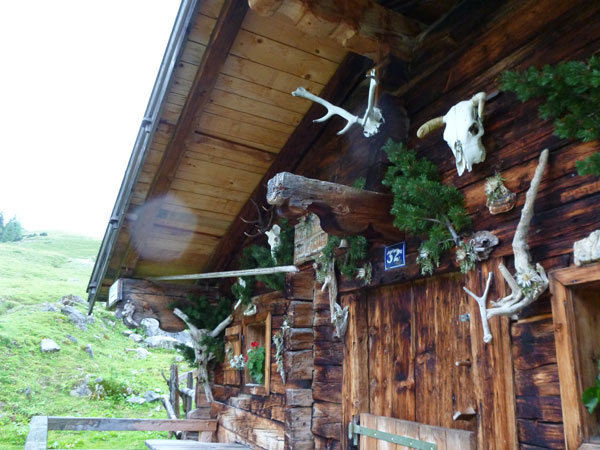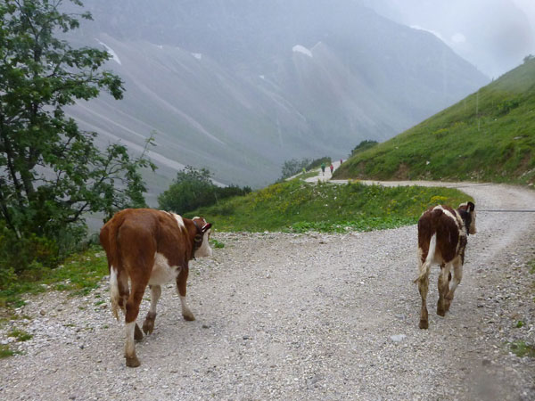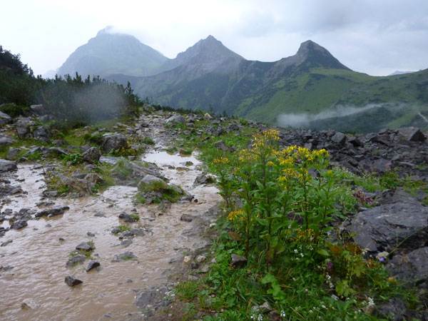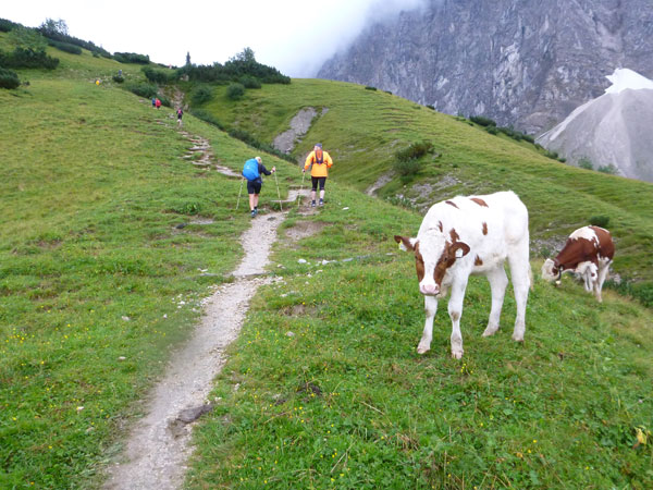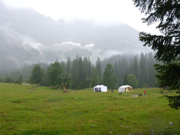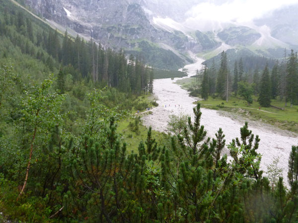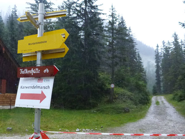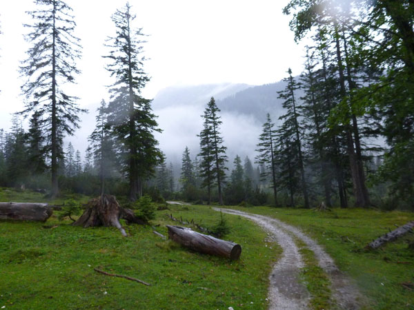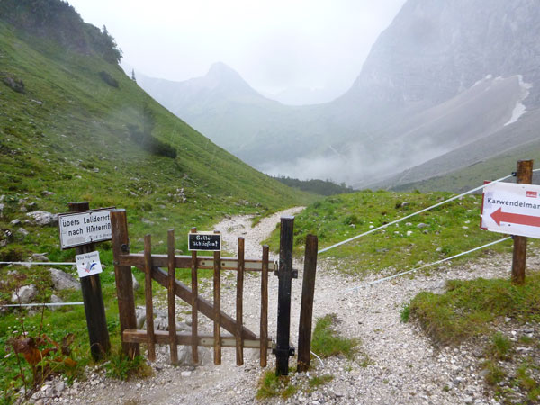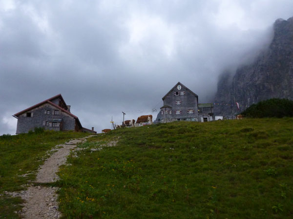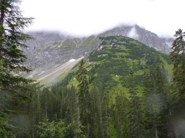 Bis zur Falkenhütte sind wieder 600 Höhenmeter fällig, die zweite Hälfte davon ab Ladizalm richtig steil. Dafür wird der Blick, je weiter es hoch geht, umso schöner auf die mächtigen Ladiderer Wände vor uns. Trotz vieler Wolken sind sie momentan gut zu sehen. 900 Meter wachsen sie fast senkrecht hoch bis unter die Gipfelbereiche der Laliderer Spitze und Grubenkarspitze auf 2.600 m. Die aufeinanderfolgende Reihe der gewaltigen Felswände ist eines der bekanntesten Klettergebiete der Nördlichen Kalkalpen. Ab Falkenhütte hat man einen genialen Überblick über die traumhafte Kulisse. Bei Erreichen der dortigen Labestation verfinstert sich der Himmel und verdirbt aber kurzfristig den Ausblick. Ein weiterer gewaltiger Schauer prasselt auf uns hernieder.