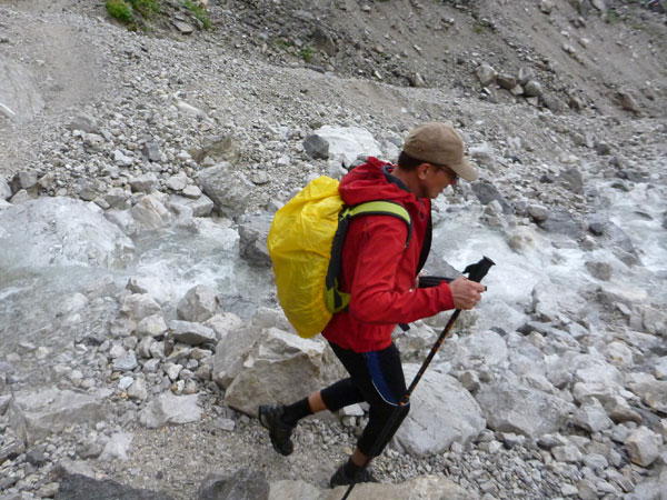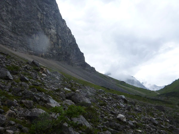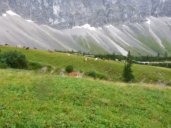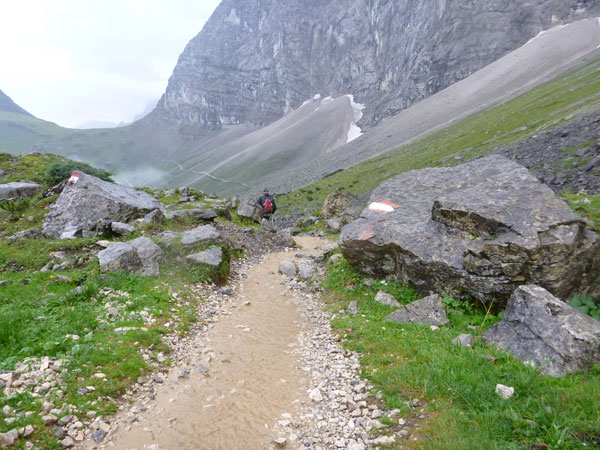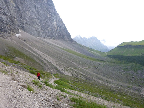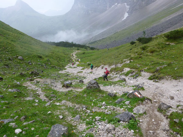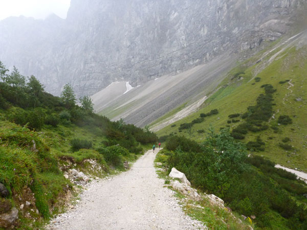 Der weitere Weg führt uns direkt in einer Senke unterhalb der dunklen Felswände entlang. Im Oktober 2011 gab es einen der größten Felsstürze der vergangenen Jahre. Von der Laliderer Spitze sind mitten in der Nacht, große Felsbrocken gut 600 Meter herabgestürzt. Richtig mitbekommen hat das niemand. Doch als die Wirte der Falkenhütte am nächsten Tag aus dem Fenster schauten, sah es so aus, als hätte es geschneit. Weiß bedeckt waren die Bäume und es lag Staub in der Luft. „In geologischen Zeiträumen gesehen, kommt so etwas sehr häufig vor“, meinte ein Geologe dazu. Auf seinem Gebiet wird allerdings in tausenden von Jahren gerechnet. Ich denke, das können wir riskieren.