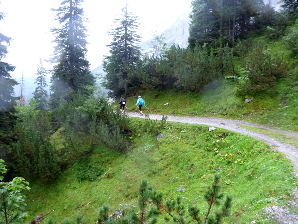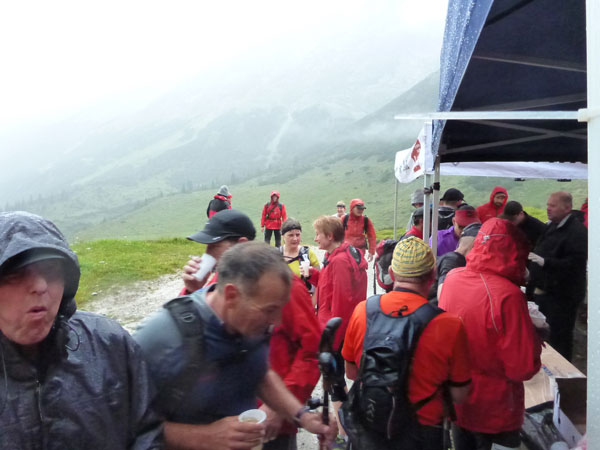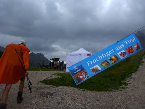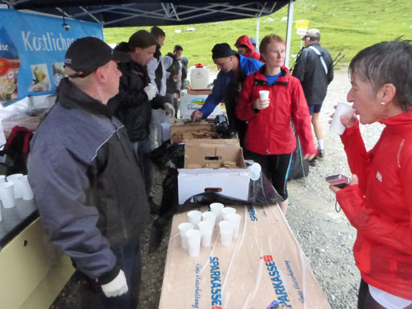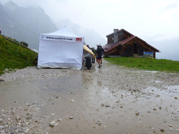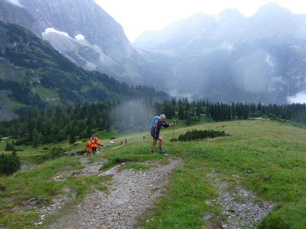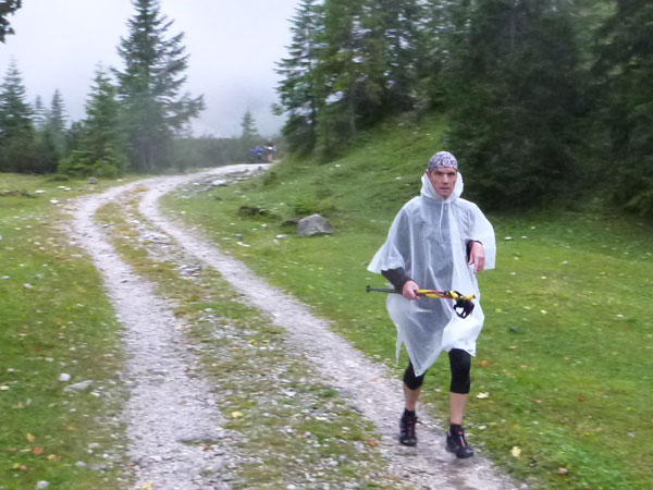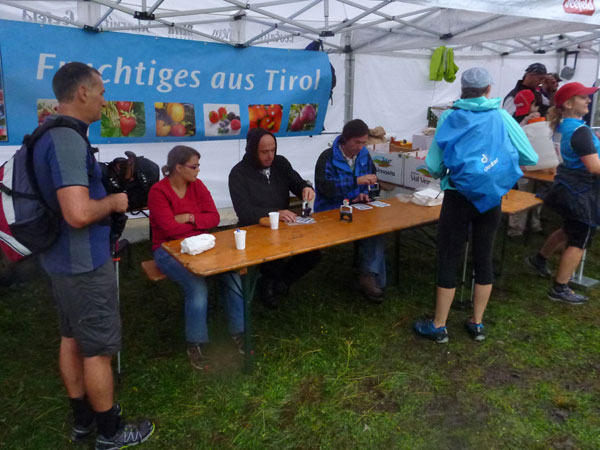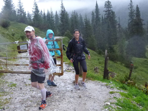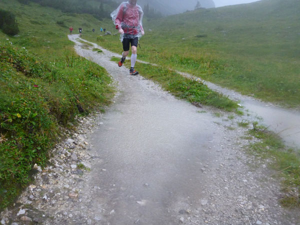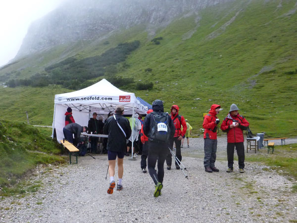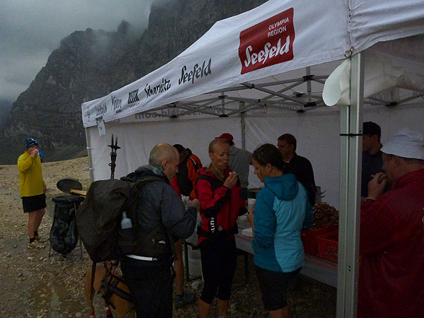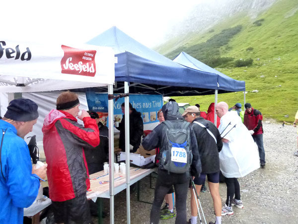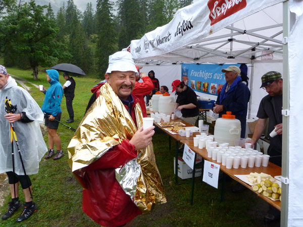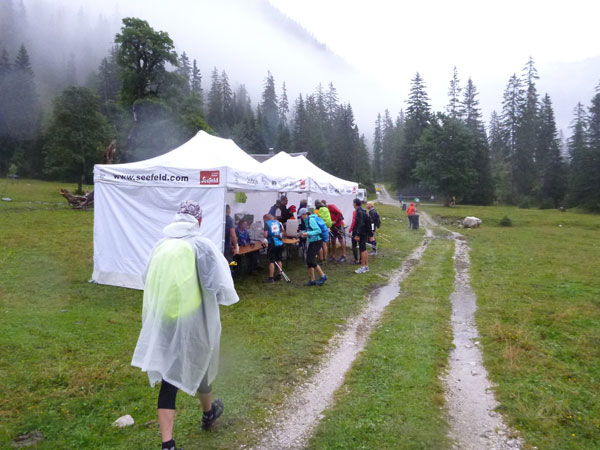 Schmierig, nass und steil ist der Weg runter in die Eng. Wer von den Wanderern die verkürzte Variante mit 35 km bevorzugt, oder das Zeitlimit um 14 Uhr überschreitet, für den ist in an der Engalm finish. An der Labe gibt es eine sensationelle Gemüsesuppe. Ich genehmige mir gar drei Becher davon und obendrauf noch die köstliche Heidelbeersuppe. Besser geht’s kaum. Gels habe ich zwar auch im Rucksack, bei den angebotenen Leckerbissen bleiben sie heute unangetastet.