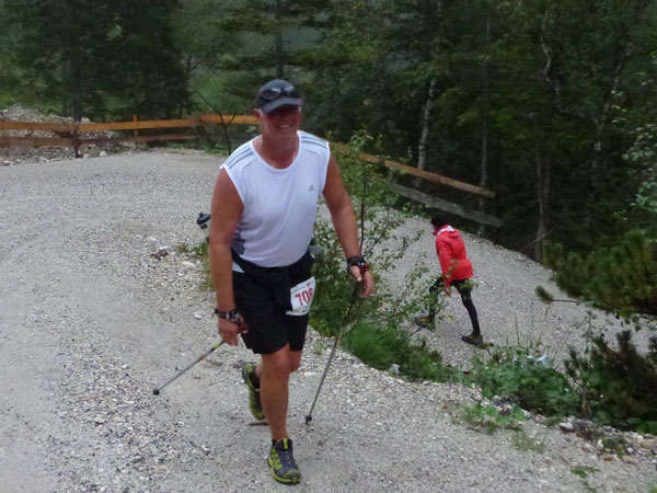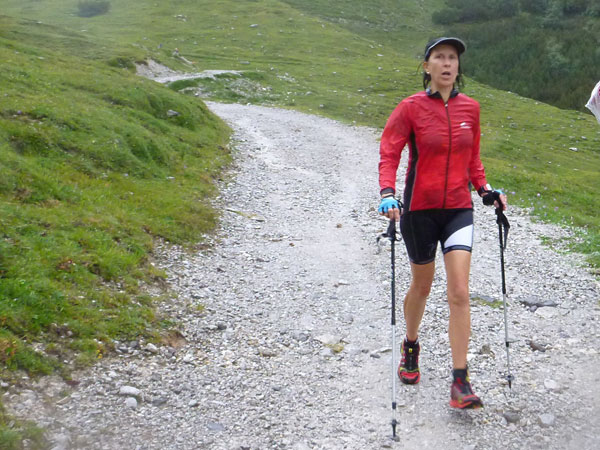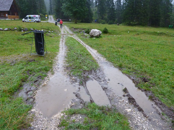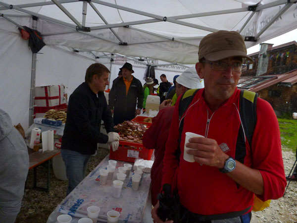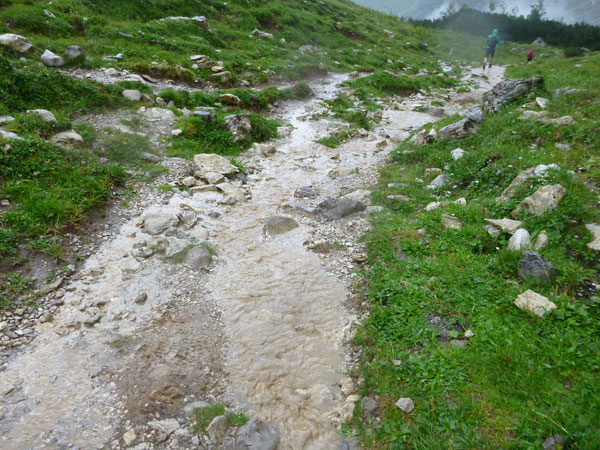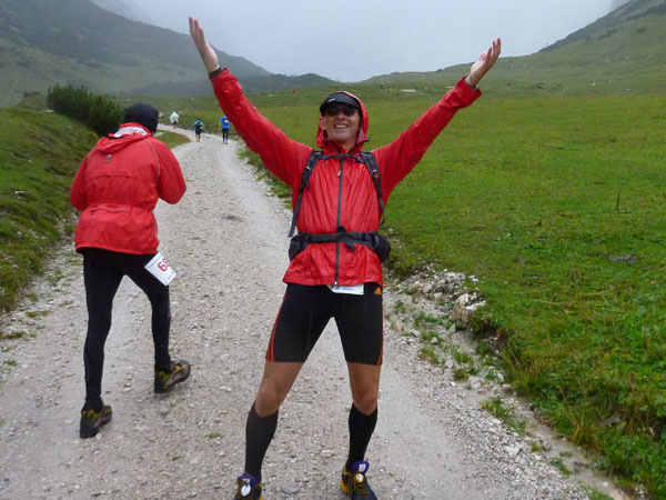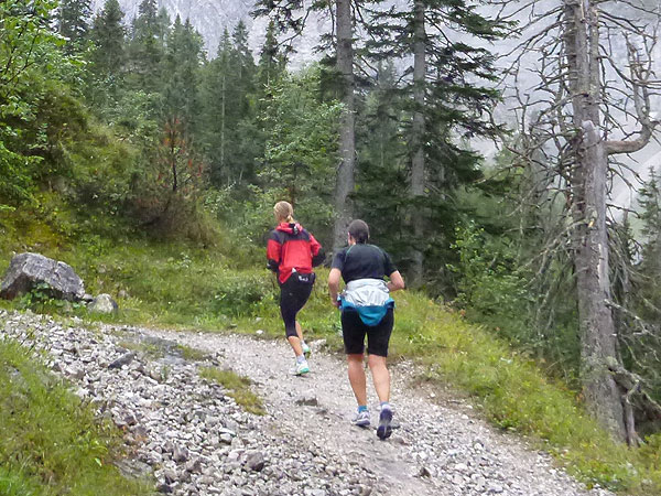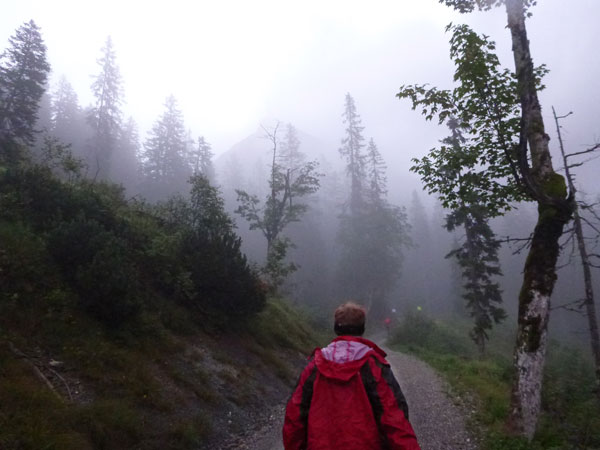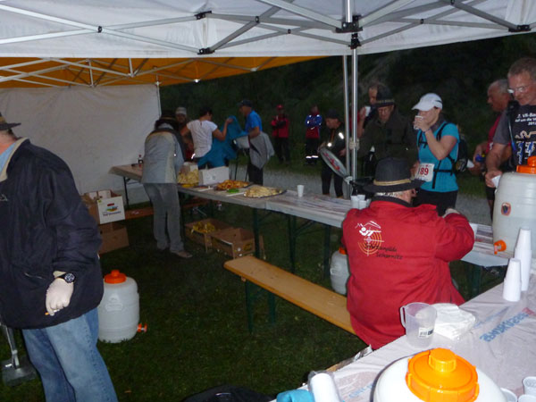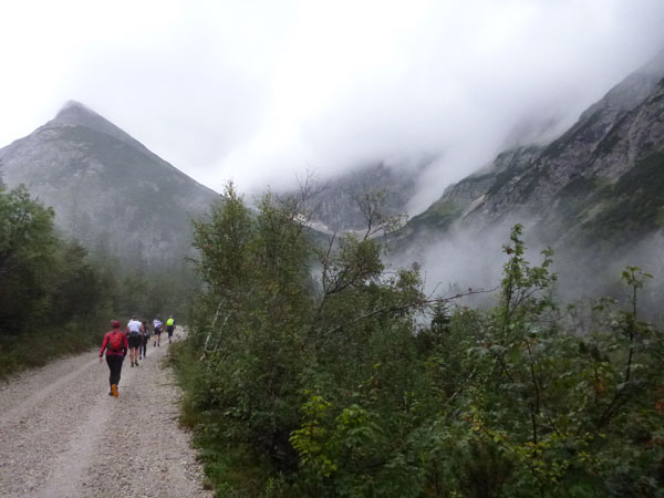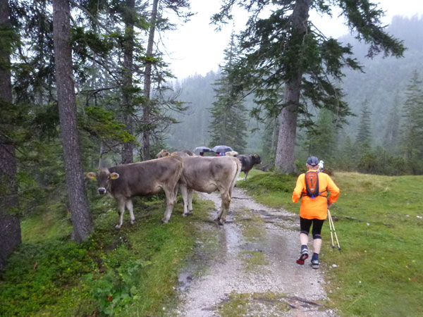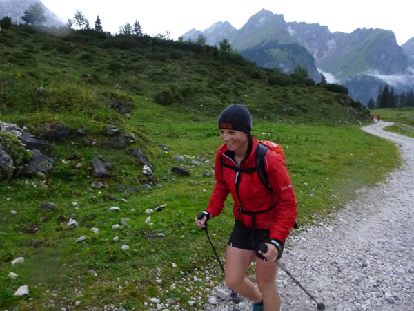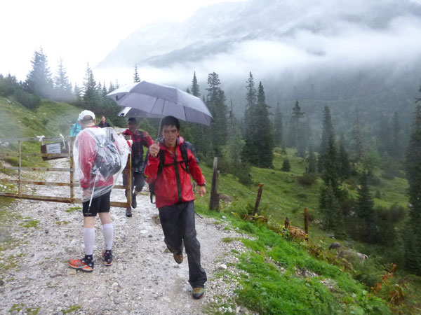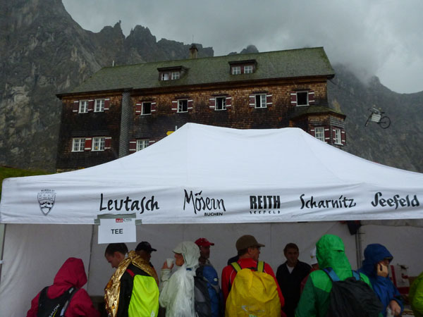 Schmierig, nass und steil ist der Weg runter in die Eng. Wer von den Wanderern die verkürzte Variante mit 35 km bevorzugt, oder das Zeitlimit um 14 Uhr überschreitet, für den ist in an der Engalm finish. An der Labe gibt es eine sensationelle Gemüsesuppe. Ich genehmige mir gar drei Becher davon und obendrauf noch die köstliche Heidelbeersuppe. Besser geht’s kaum. Gels habe ich zwar auch im Rucksack, bei den angebotenen Leckerbissen bleiben sie heute unangetastet.