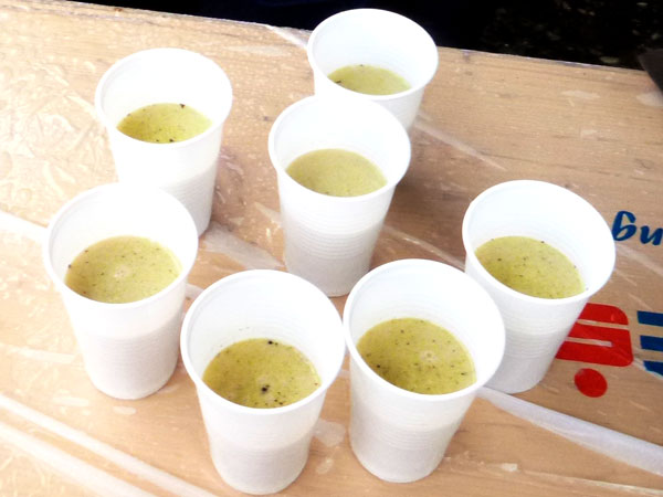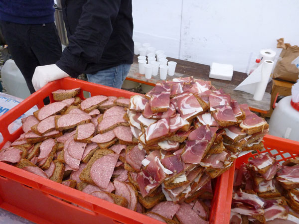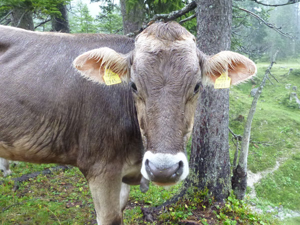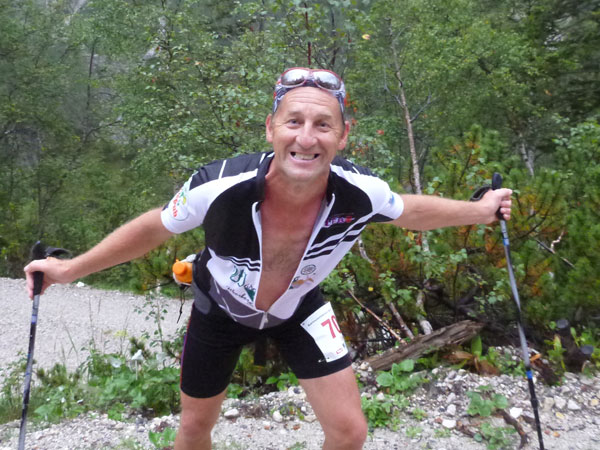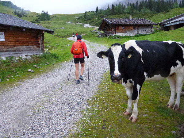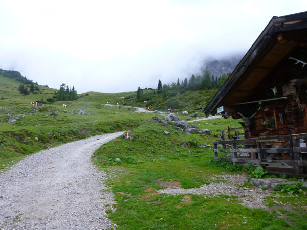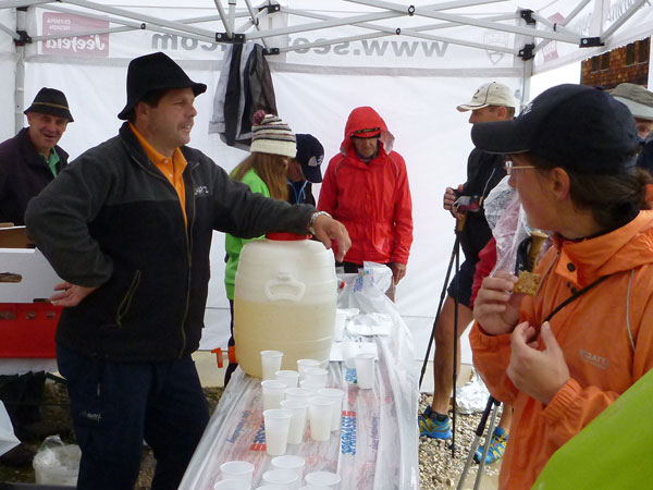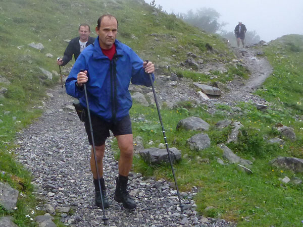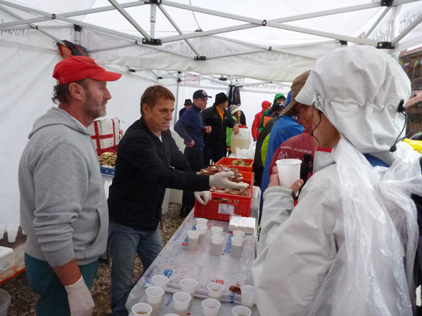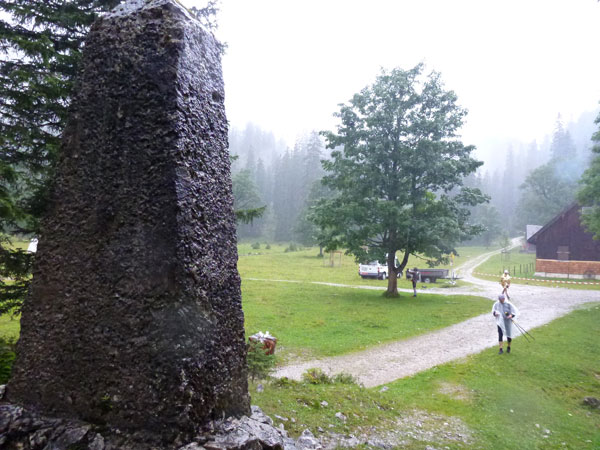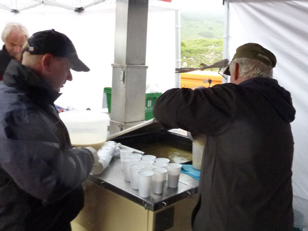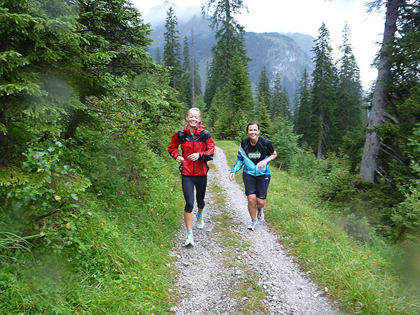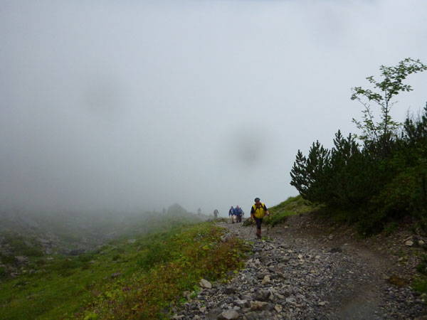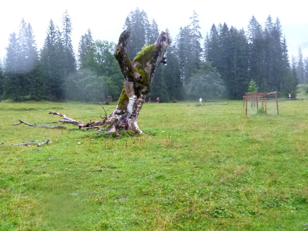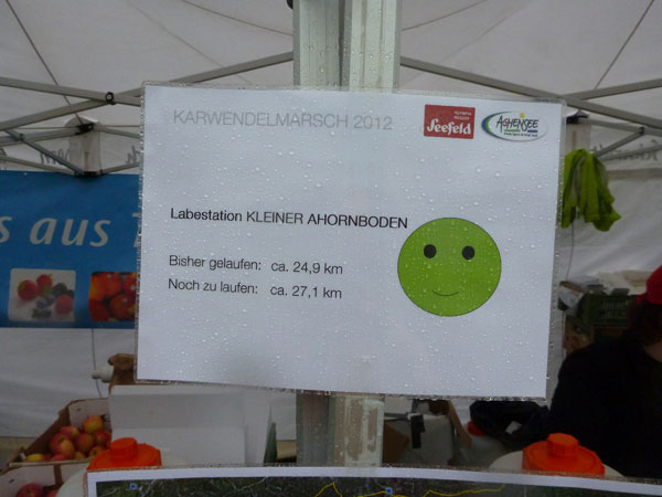 Schmierig, nass und steil ist der Weg runter in die Eng. Wer von den Wanderern die verkürzte Variante mit 35 km bevorzugt, oder das Zeitlimit um 14 Uhr überschreitet, für den ist in an der Engalm finish. An der Labe gibt es eine sensationelle Gemüsesuppe. Ich genehmige mir gar drei Becher davon und obendrauf noch die köstliche Heidelbeersuppe. Besser geht’s kaum. Gels habe ich zwar auch im Rucksack, bei den angebotenen Leckerbissen bleiben sie heute unangetastet.