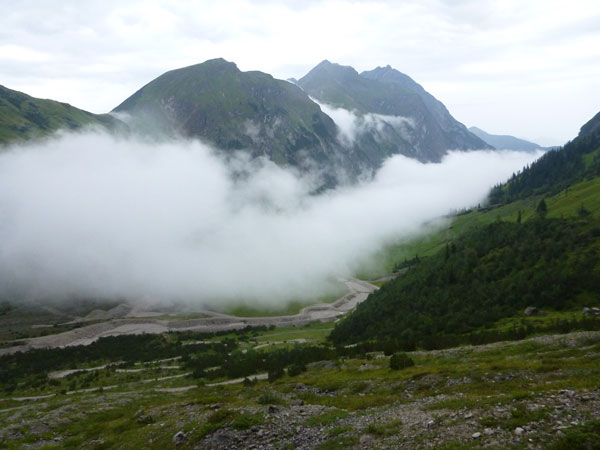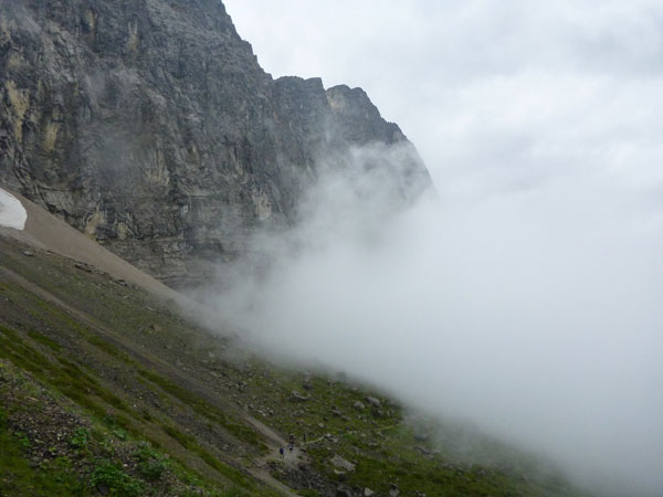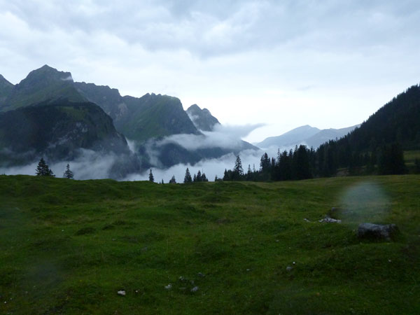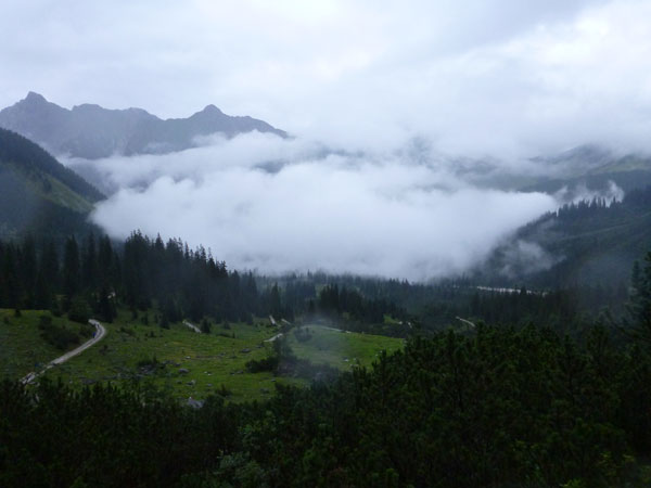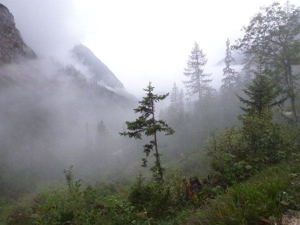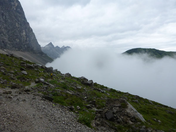Unten im Ladiderer Tal hängt eine riesige schneeweiße Wolkenbank. Faszinierend beobachte ich, wie sie sich nach oben ausbreitet. Binnen weniger Minuten hat sie den Beginn der Felswände erreicht. Puuh, Glück gehabt, genau als ich das Gebiet verlasse. Erinnert mich irgendwie an die Szene aus „The Fog – Nebel des Grauens“, als der Nebel alles verschlang und dann Unheimliches passierte.