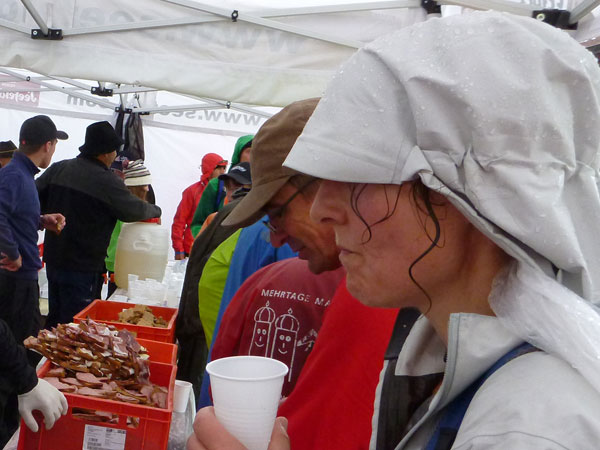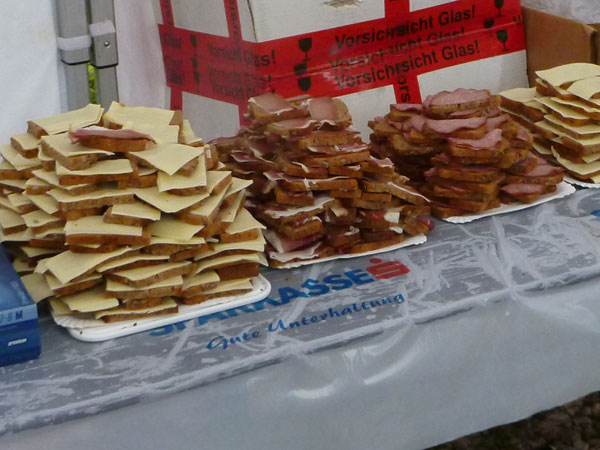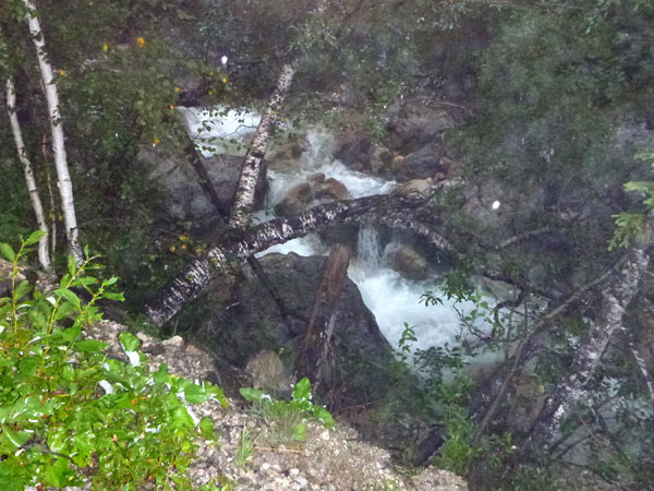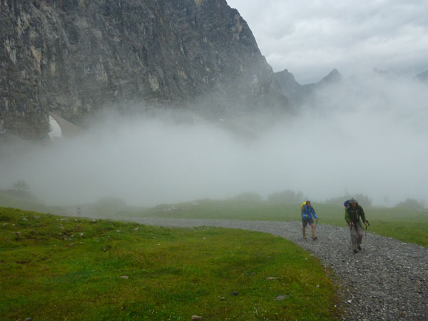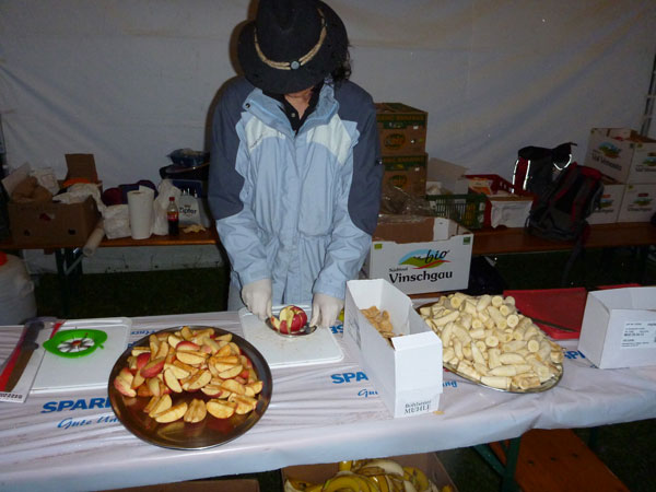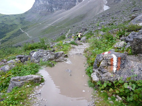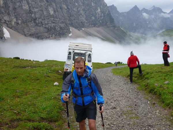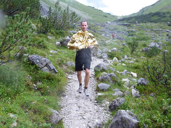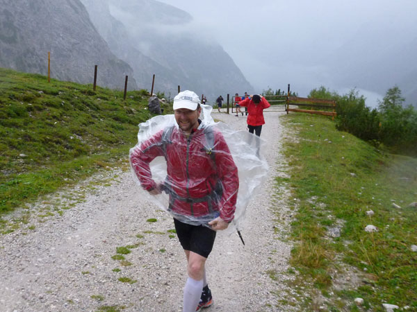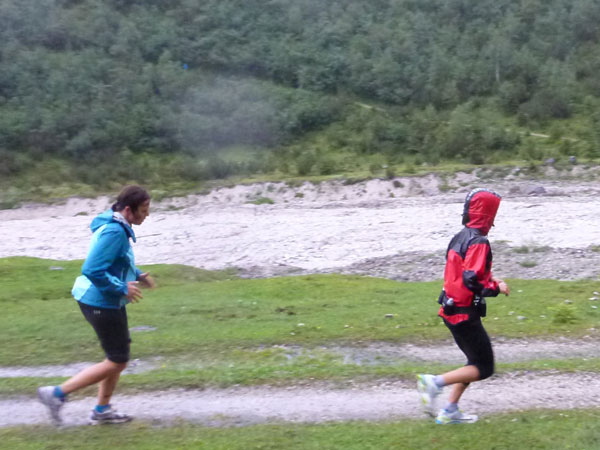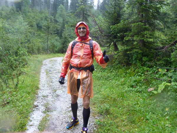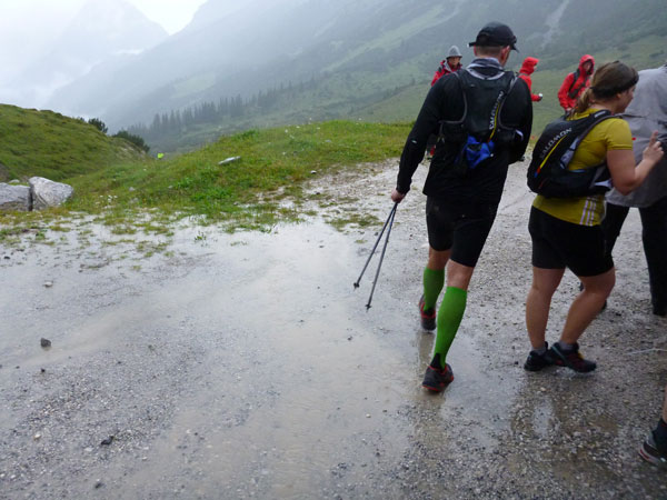 Just an der VP fängt es wieder richtig zum schütten an, alle drücken sich unter die Dachüberstände an der Labe. Hier an der freien und zugigen Stelle ist es auch spürbar kälter geworden, meine Finger sind klamm und natürlich muss der schützende Aufenthalt auch mal beendet werden. In meiner Vollausstattung befindet sich noch eine der orangefarbenen Überziehfolien. Das sind die Dinger, die zur Wärmung beim Jungfrau Marathon oder bei Schlechtwetter während des Swissalpine vom Veranstalter ausgeben werden und von einigen bei Wetterbesserung leider schnell wieder in der Landschaft entsorgt werden. Dabei können sie doch meist problemlos wieder verwendet werden und für gute Dienste sorgen, so wie meiner hier.