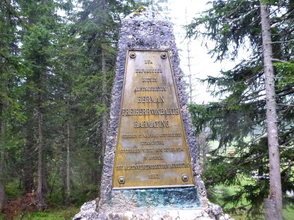Hermann von Barth gilt als der alpine Erschließer des Karwendels. 88 der über 200 Gipfel des Karwendels soll er allein im Sommer 1870 bestiegen haben. Ihm zu Ehren hat man ein Denkmal gesetzt, es liegt direkt neben unserer Laufstrecke mit herrlichem Überblick über den kleinen Ahornboden und seinem alten Baumbestand. Einige der Bergahornbäume haben bis zu 600 Jahre auf dem Buckel. Dabei sind aber auch einige eingezäunte Neupflanzungen.14 Patenschaften werden dafür jährlich vergeben, für 300 Euro ist man dabei und wird so Pate eines Bergahorns und kann damit einen Beitrag für Maßnahmen zum Umweltschutz leisten.