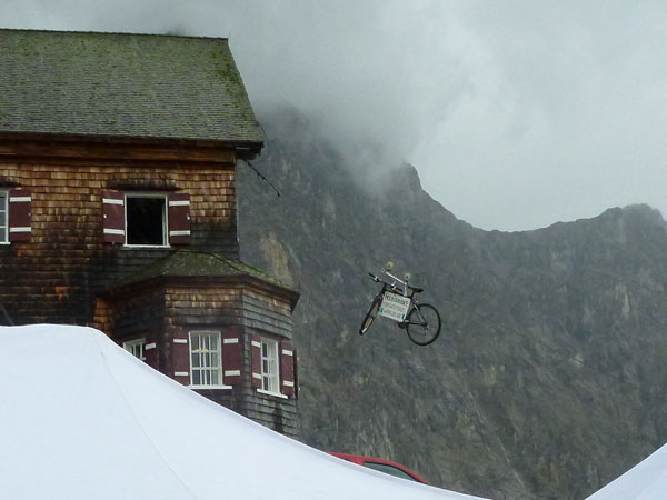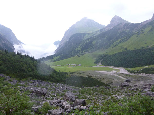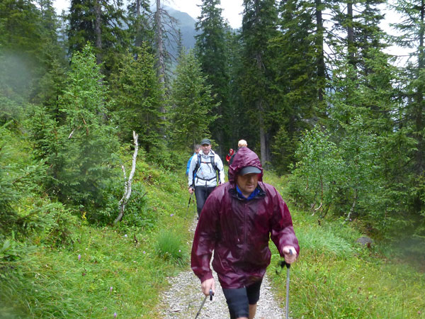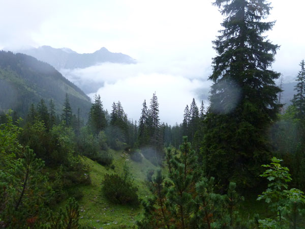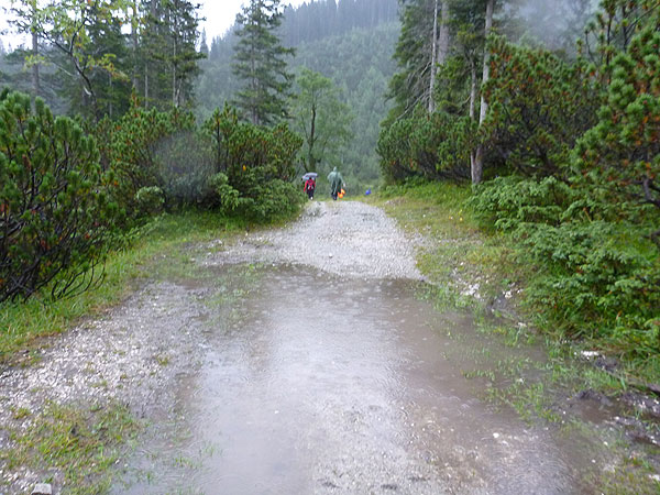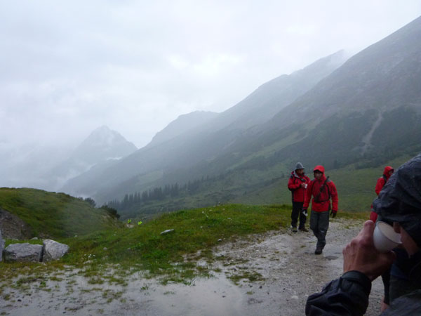 Bis zur nächsten Labestation im 6 km entfernten kleinen Ahornboden verlieren wir von unseren 850 positiven Höhenmetern wieder mehr als die Hälfte. In Serpentinen führt uns der rustikale Weg runter ins Tal. Auf die Nase legen möchte ich mich auf der Schotterpiste ungerne und kontrolliere daher lieber mein Abwärtstempo. Dankbar bin ich für meine Folie, im Nu ist mir wieder warm geworden und der Regen ist mir Schnuppe. Ebenfalls dabei habe ich heute ganz neu eine der wasserdichten Outdoorkameras. So kann ich nach Herzenslust auch im stärksten Regen noch Fotos schießen.