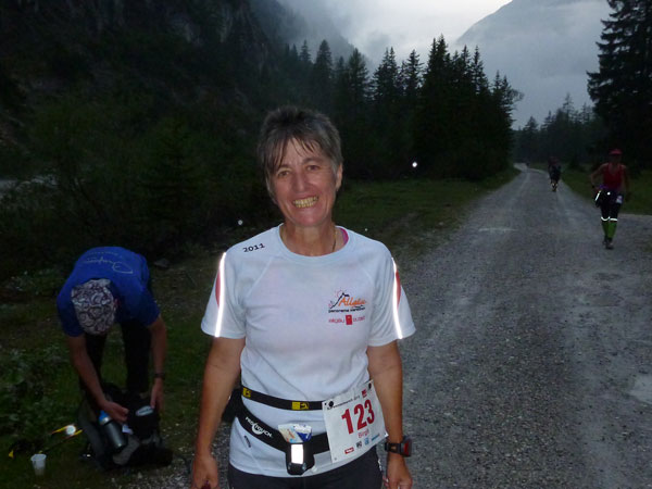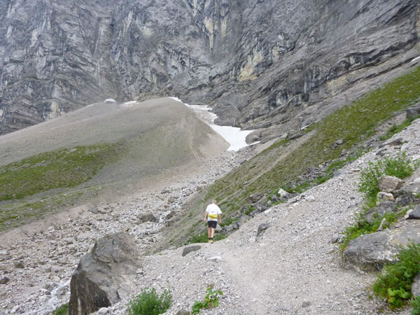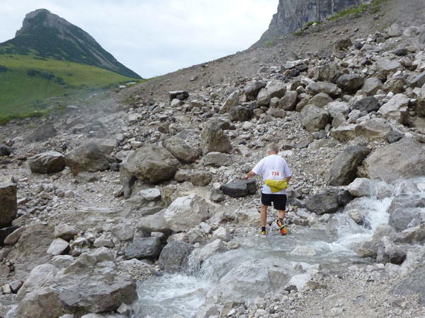 Nach durchqueren eines Schotterfeldes geht’s wieder aufwärts. Vor mir laufen „die Küken“, so nennen sich Manuela und Petra. Wie sie den Aufstieg mit lockeren Tippelschritten bewältigen, sieht echt toll aus. Ich hoffe insgeheim für sie, dass sie damit nicht a bisserl zu früh ihr Pulver verschießen. In unserer Preisklasse läuft hier sonst keiner mehr so leichtfüßig den Berg hinauf, der Gewinn gegenüber Gehtempo ist auch nur sehr gering. Ein paar Fotos ist der Mut mir allemal wert. „Wo gibt’s die zu sehen?“ werde ich gefragt. „Auf marathon4you, kennt ihr das?“ „Ja klar! Warst du das: mit Blaulicht durch Rom?“. „Nein, das war der Joe.“