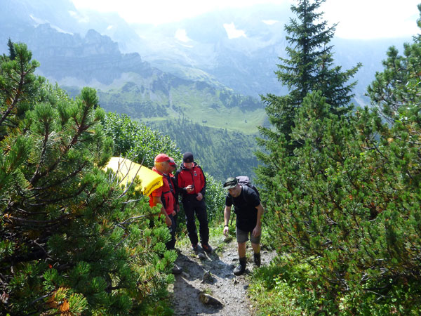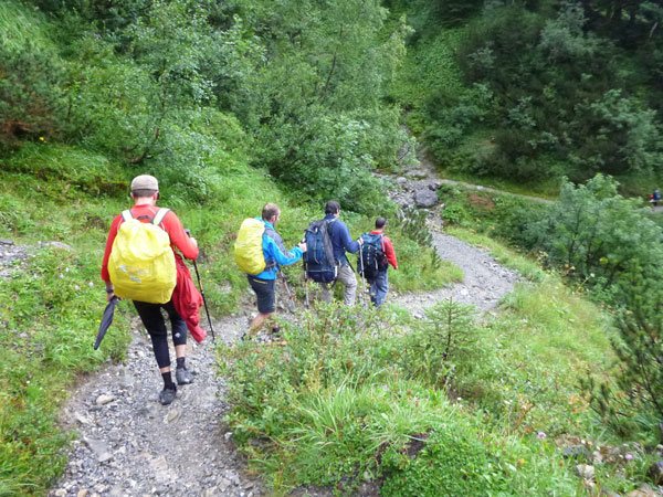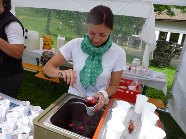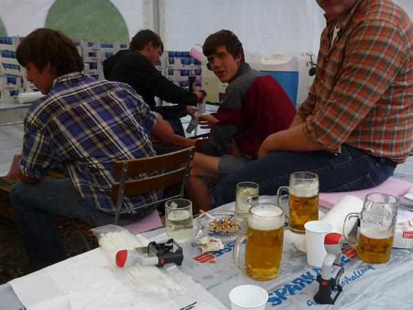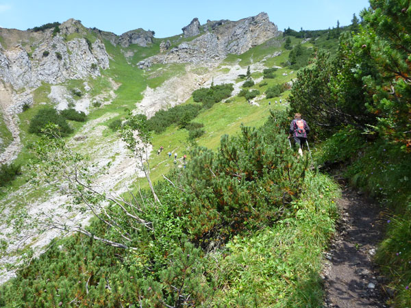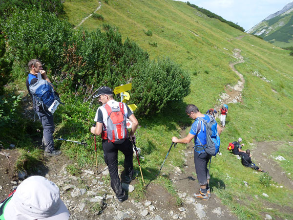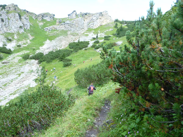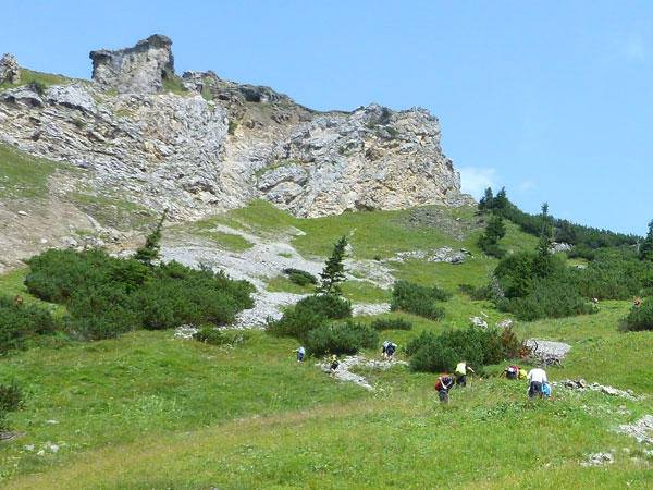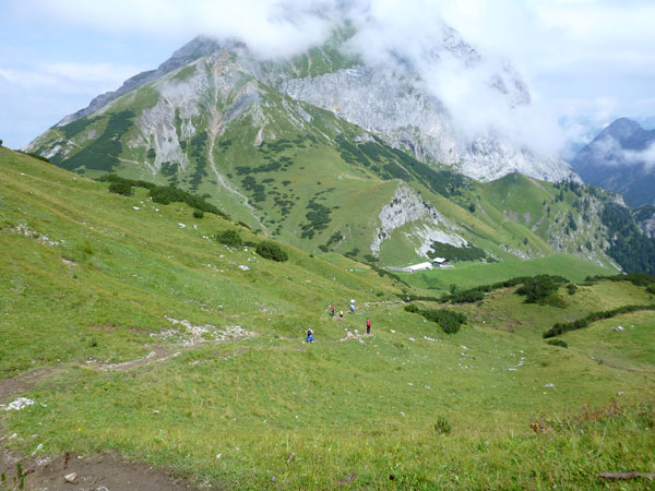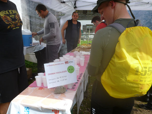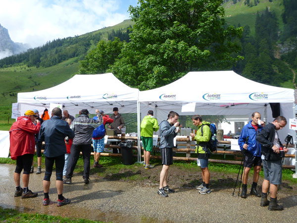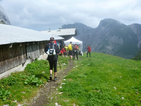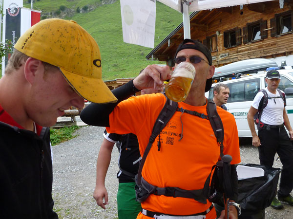 Ein paar hundert Meter führen durch den großen Ahornboden und dann beginnt der letzte Aufstieg, aber auch der steilste, hinauf zum Binssattel. Zwischendrin liegt an der Binsalm ein weiterer VP. Ein paar Burschen sitzen vor frisch eingeschenkten Bierkrügen. „Ist da für mich auch ein Schluck dabei?“, frage ich vorsichtig an. „Nimm dir ruhig eine Halbe“, bekomme ich zu hören. Das muss mir natürlich keiner zweimal sagen, da halt ich’s wie der Anton und bin kein Kostverächter.