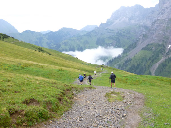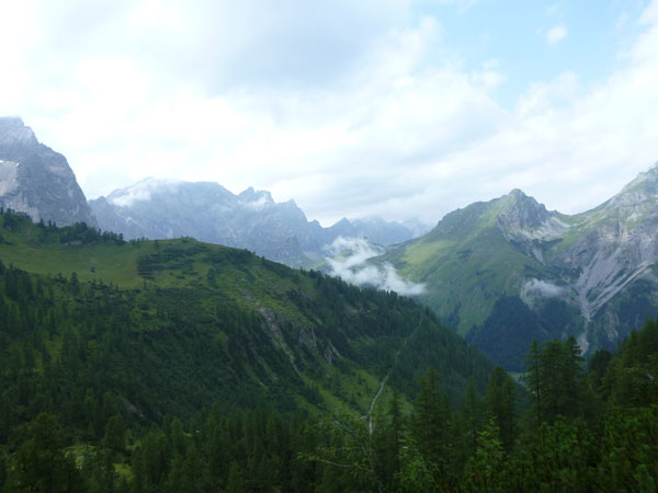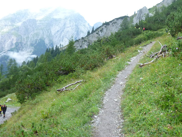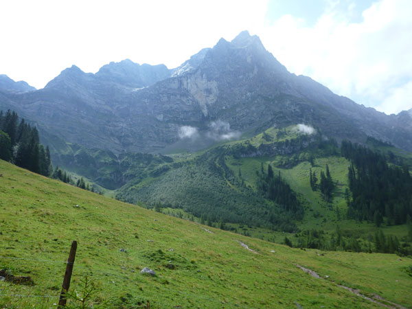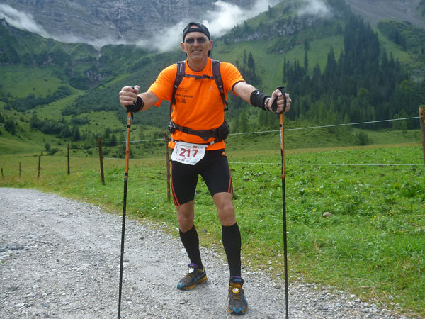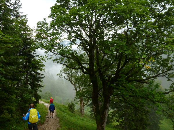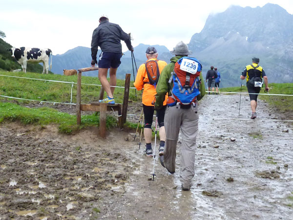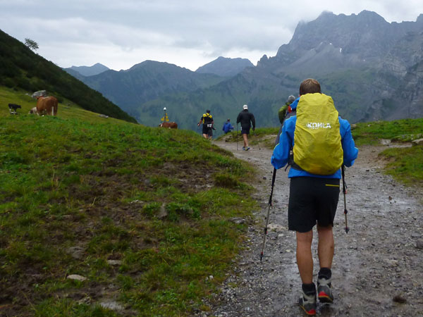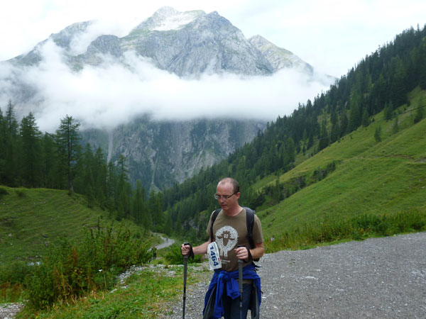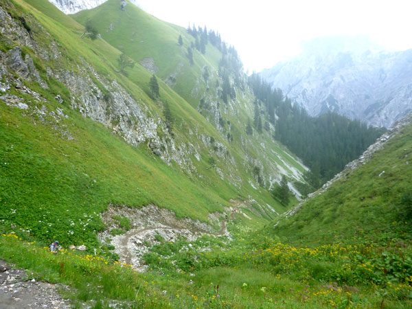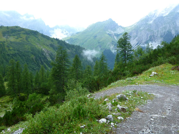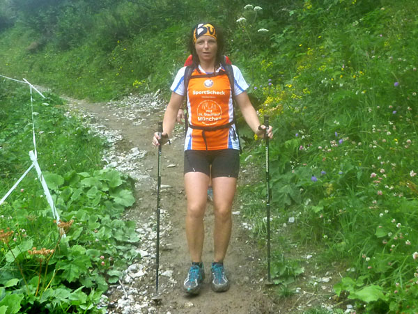 Ein Stückchen geht es noch auf einer Kiesstraße weiter, dann geht der Weg in einen herrlichen Single-Trail über. Ich bin froh, hier meine Stöcke benutzen zu können. Der Pfad ist sehr steil und auch vom vielen Regen gefährlich rutschig. Plötzlich bin ich oben, über einen Grad kann man ins sonnenüberflutete Falzthurntal blicken. Im Vorjahr waren hier die Almen mit Schnee.überzogen. Die nächste Brotzeitstation am Gramaihochleger liegt auch schon im Blickfeld und ist schnell erreicht. 40,5 km sind dort durch.