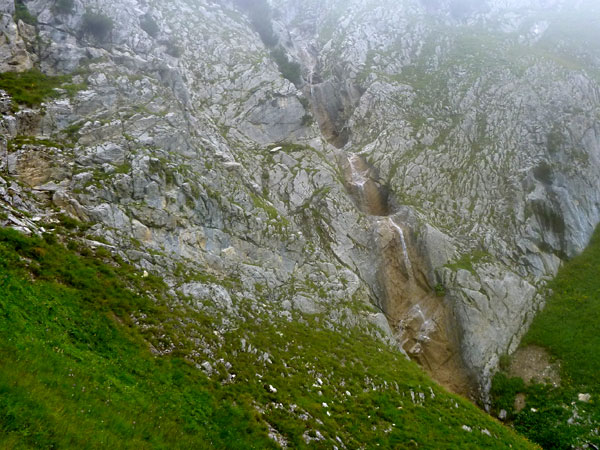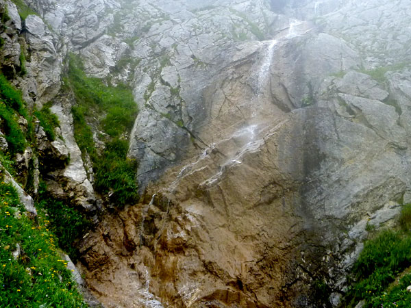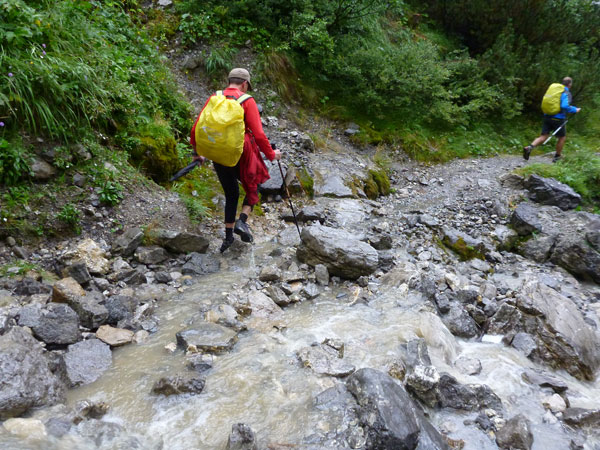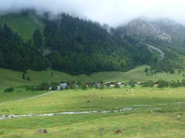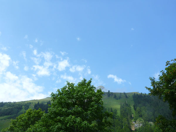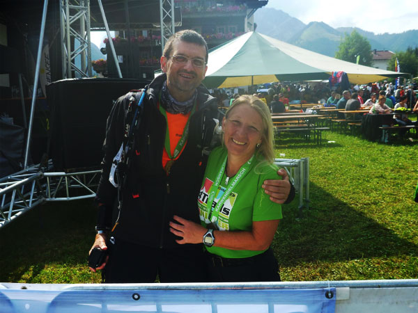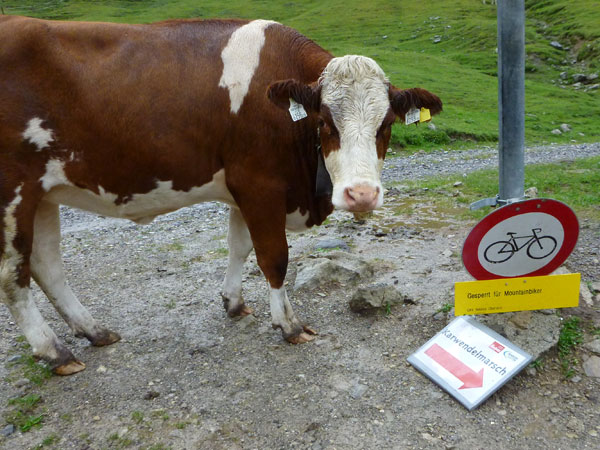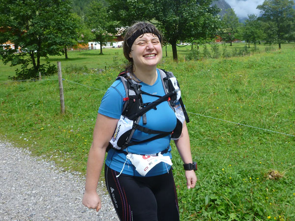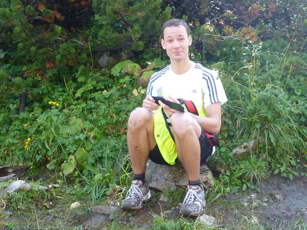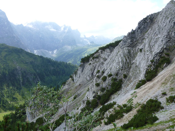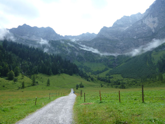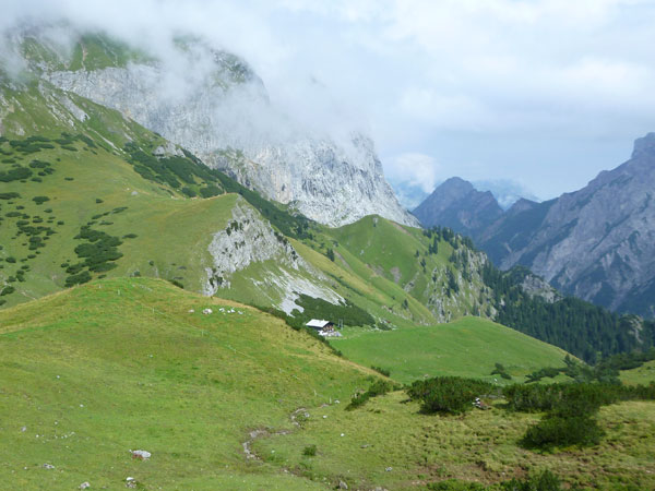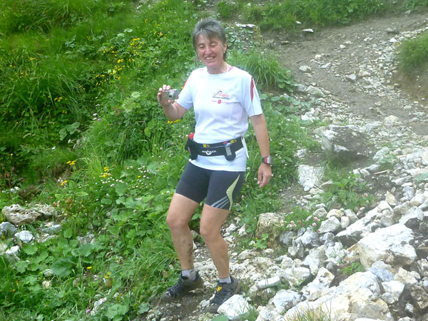 Ein Stückchen geht es noch auf einer Kiesstraße weiter, dann geht der Weg in einen herrlichen Single-Trail über. Ich bin froh, hier meine Stöcke benutzen zu können. Der Pfad ist sehr steil und auch vom vielen Regen gefährlich rutschig. Plötzlich bin ich oben, über einen Grad kann man ins sonnenüberflutete Falzthurntal blicken. Im Vorjahr waren hier die Almen mit Schnee.überzogen. Die nächste Brotzeitstation am Gramaihochleger liegt auch schon im Blickfeld und ist schnell erreicht. 40,5 km sind dort durch.