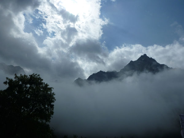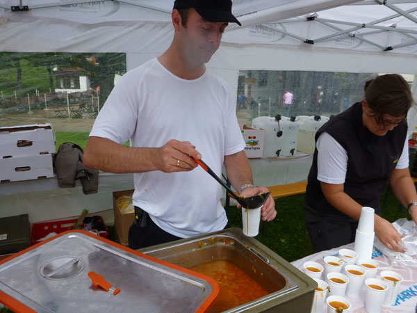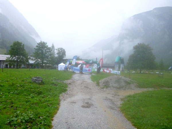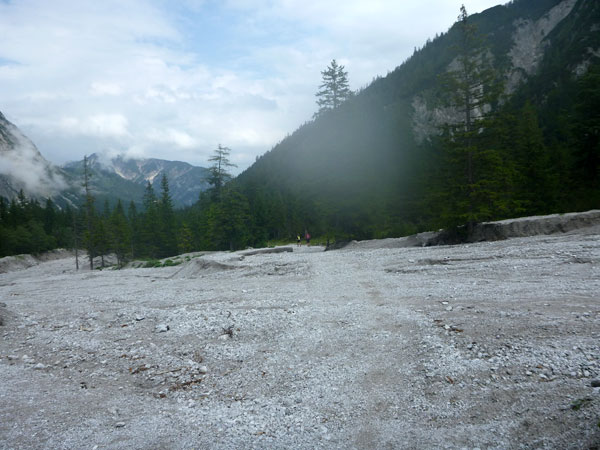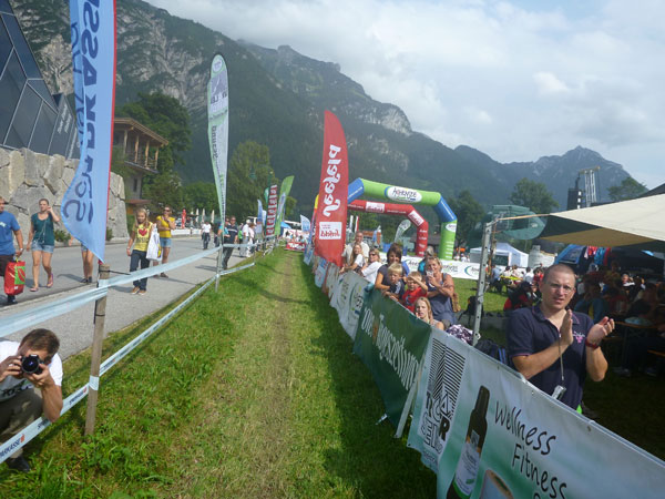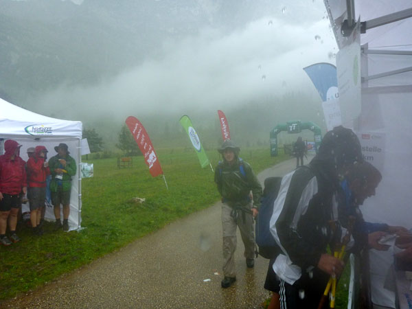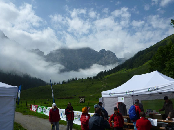 Und wieder habe ich das Glück und ein Riesenwolkenbruch donnert auf uns herab. Ich flüchte mich mit samt meiner Suppe unter’s Dach der danebenliegenden Gastwirtschaft und warte erst mal ab. Nach kurzer Zeit ist alles vorbei. Von einer Minute auf die andere zeigt sich der blaue Himmel. Sonne im Karwendel, das gibt’s seit der Neuauflage des Karwendelmarsch heute zum ersten Mal. Heute werden wieder einmal die Genussläufer belohnt, die Schnellen sind schon längst im Ziel und bekommen davon natürlich nichts mehr mit. Unglaublich, wie schnell die Wolken abziehen.