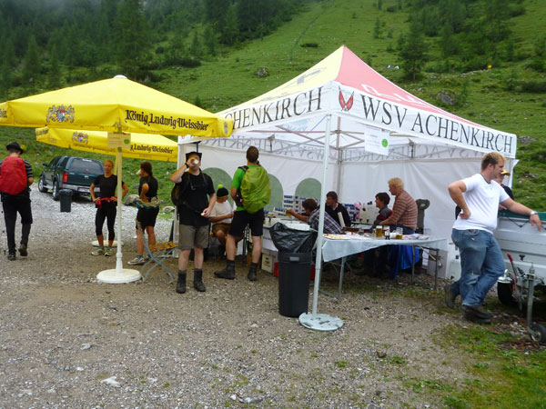 Der Bann ist gebrochen, erstmals Sonne beim Karwendelmarsch, da sollte doch das Ziel 1.500 Teilnehmer in naher Zukunft erreicht werden. Zum Meckern gäbe es eigentlich überhaupt nichts, wenn da nicht dieser Klo-Engpass bestehen würde. Ein paar Dixis am Startort, für dann noch mehr Leute, würden weiterhelfen.