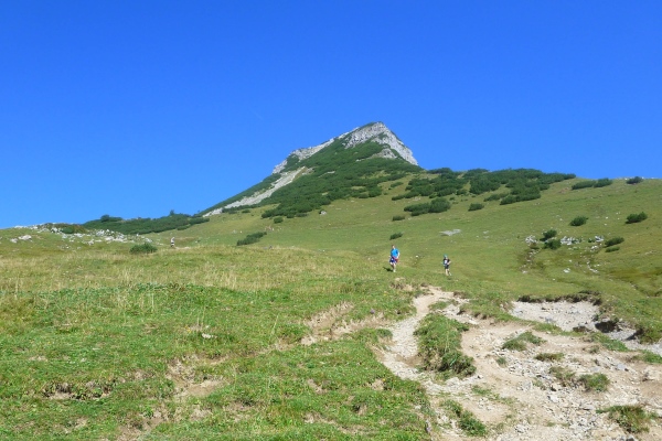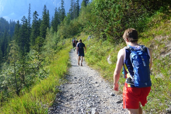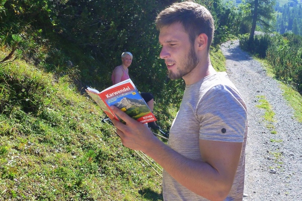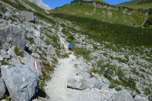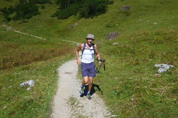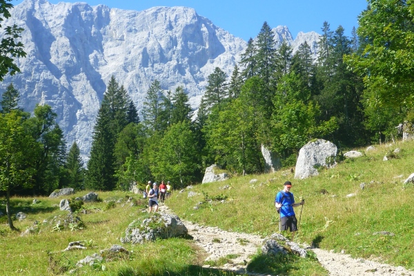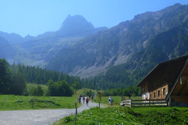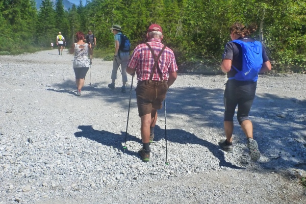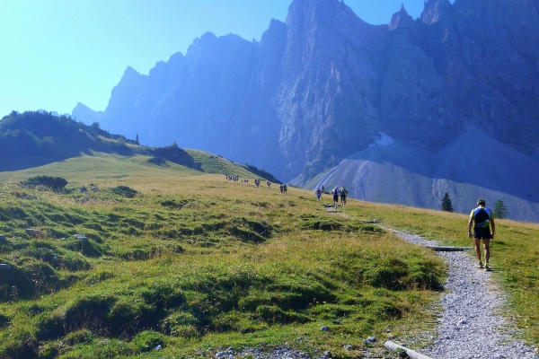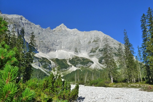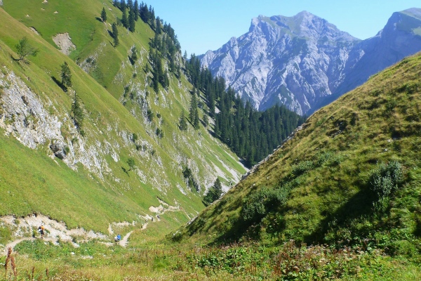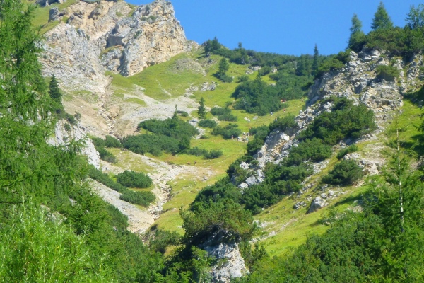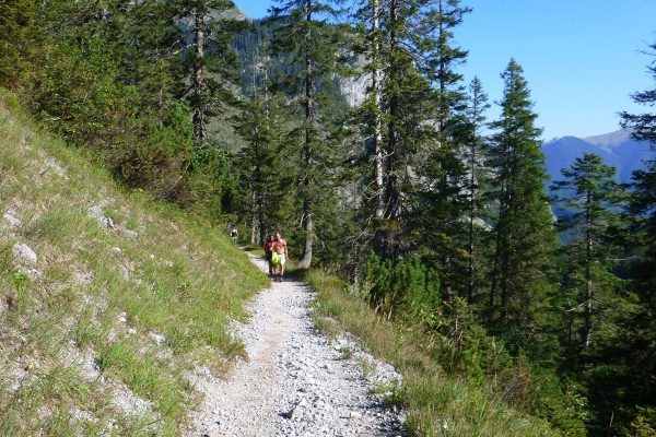 Es geht bergab Richtung Eng. Ein schöner Wanderweg verläuft zwischen Latschenkiefern nach unten. Viele Fußgänger kommen uns nun entgegen. Die Eng kann aus Deutschland über eine Mautstraße vom Sylvenstein-Stausee erreicht werden und eignet sich damit als Basis für schöne Ausflüge per pedes. Mir fallen drei Typen von Wanderern auf: