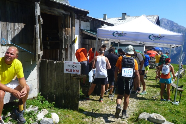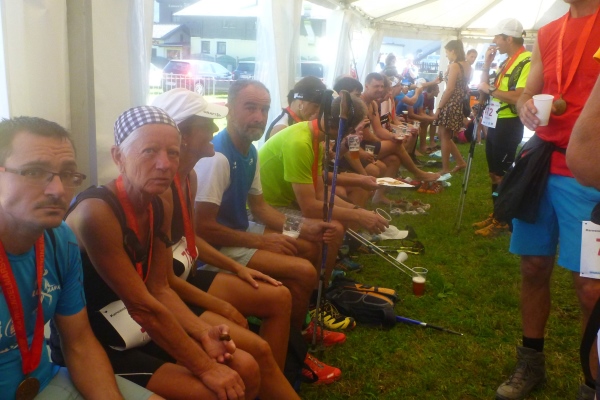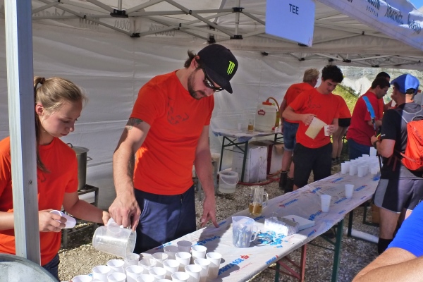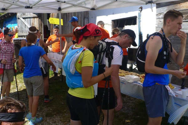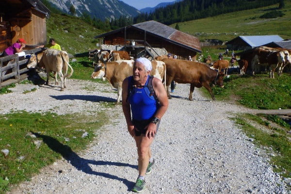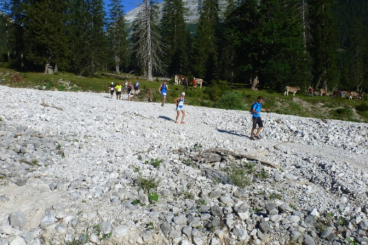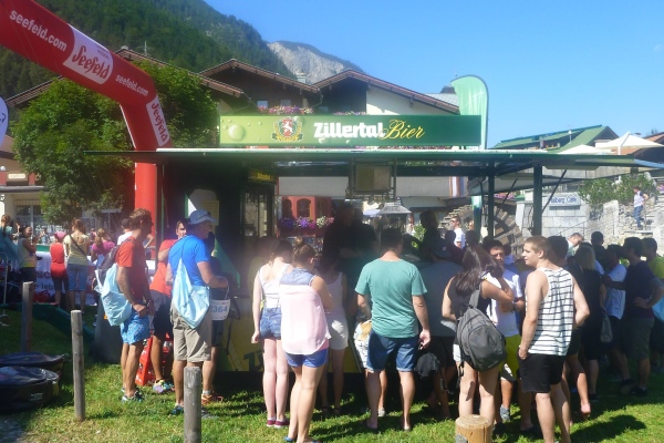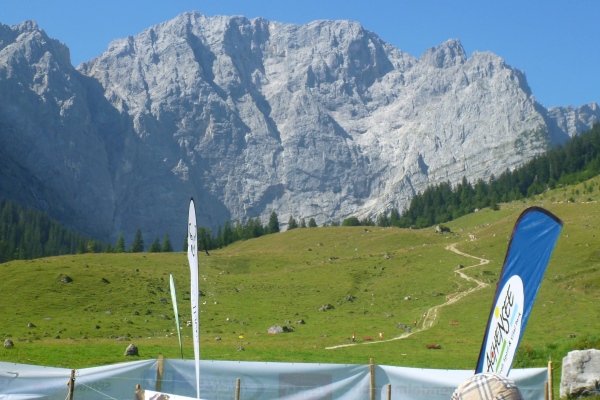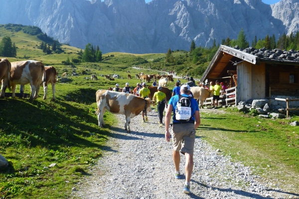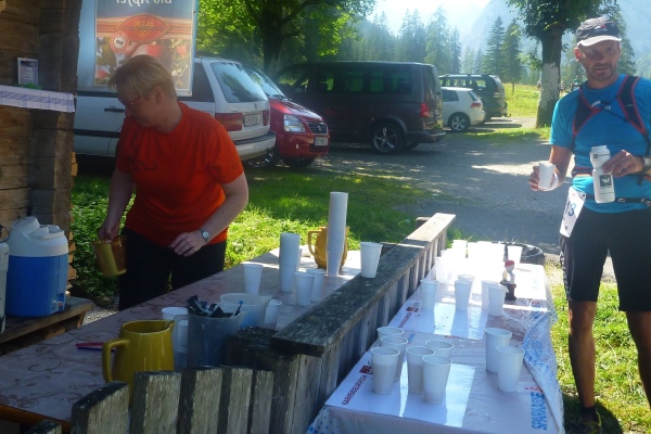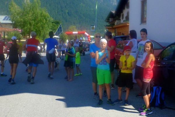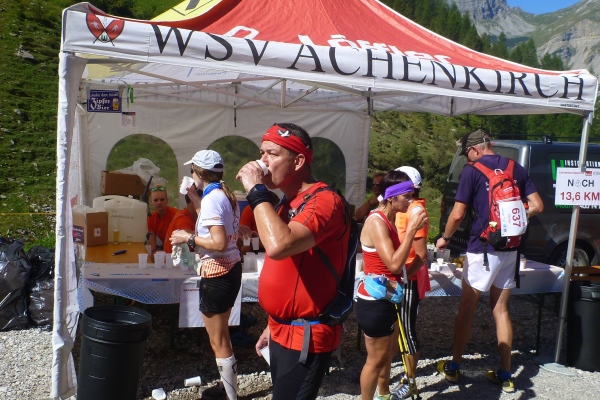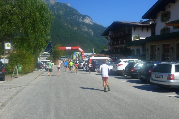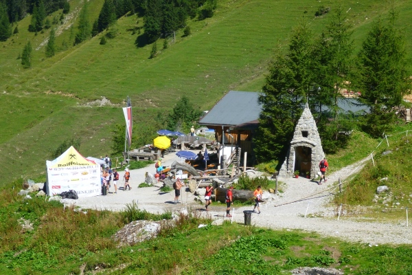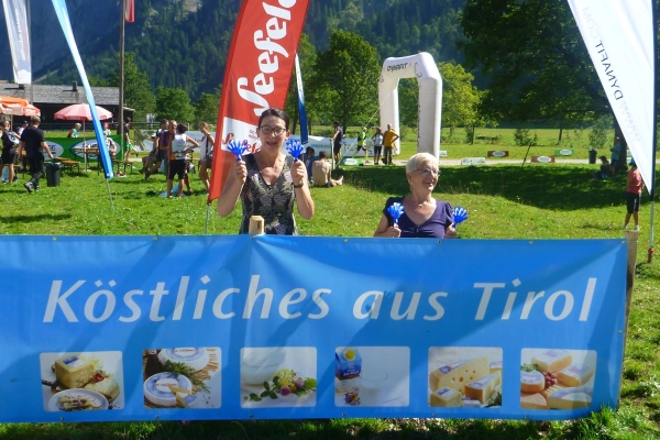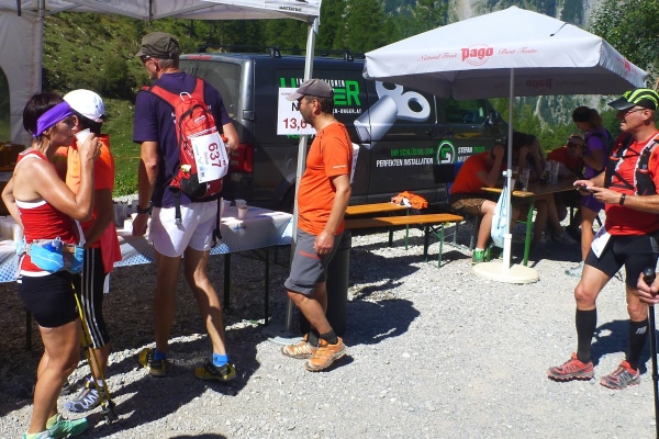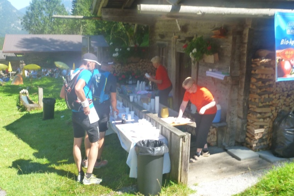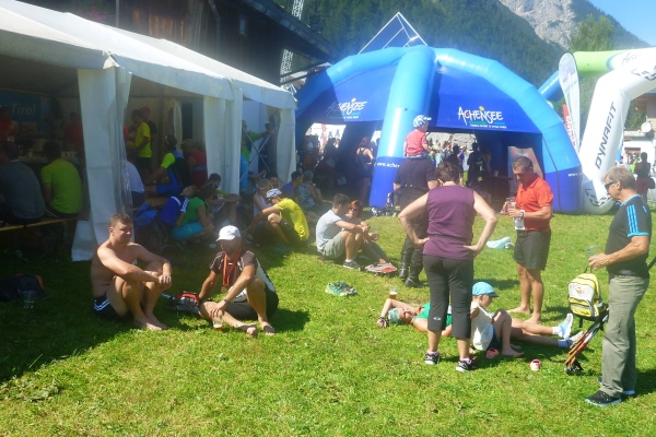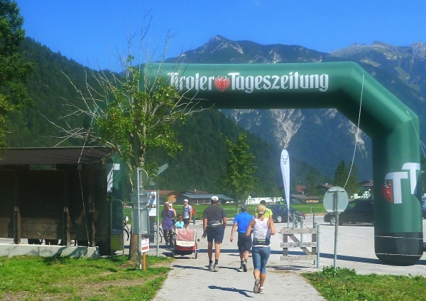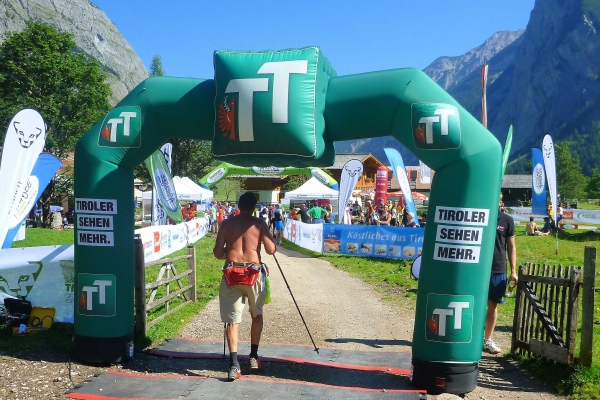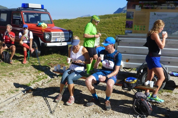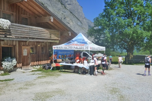 Die Eng (1.227 m, also recht weit unten) mit ihrer großen Anzahl von Almen ist nach 35 km auch das Ziel der verkürzten Strecke. Davon kündet der Torbogen der Tiroler Tageszeitung. Einige Sanitäter begutachten den Gesundheitszustand der Eintreffenden. Sie könnten auch 52-km-Läufer aus dem Rennen nehmen. Die einzige Cut-off-Zeit wäre hier um 14:30 Uhr, ist also sehr großzügig bemessen. Wir sind gut drei Stunden vorher da.