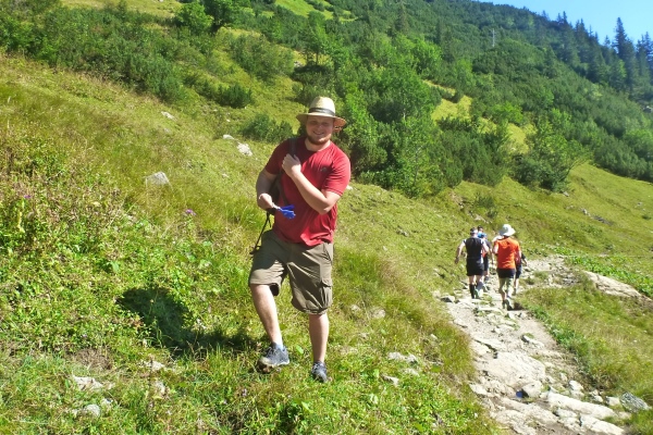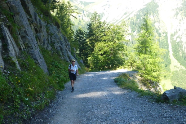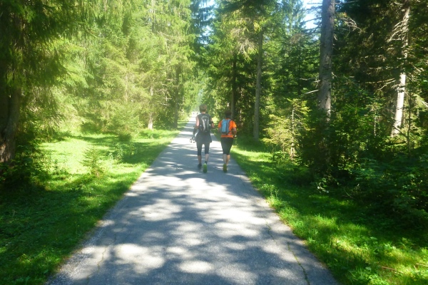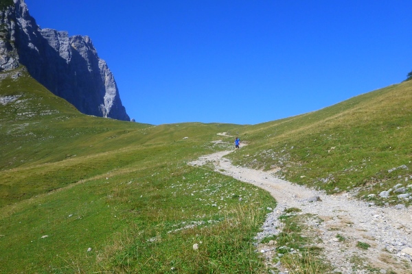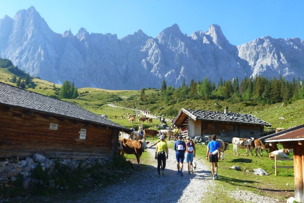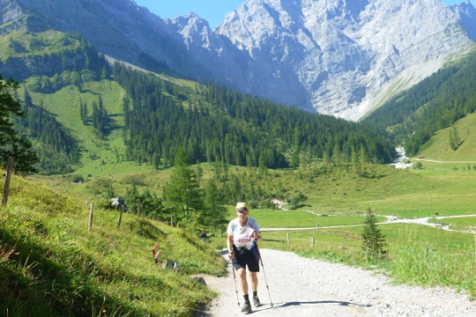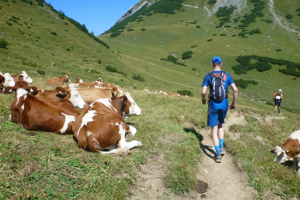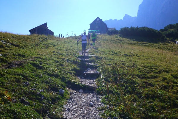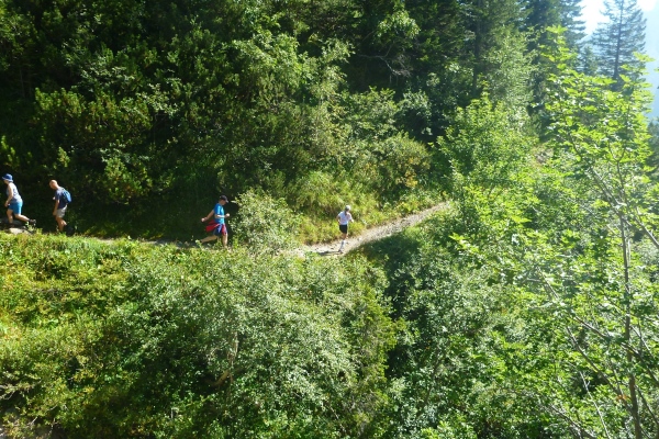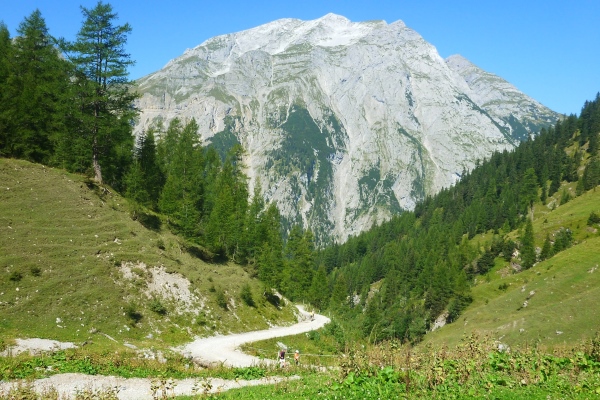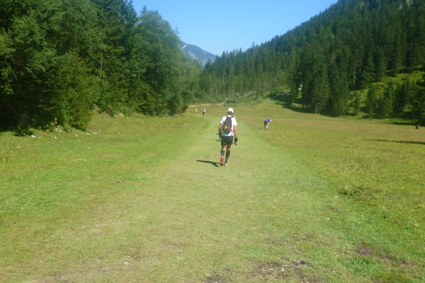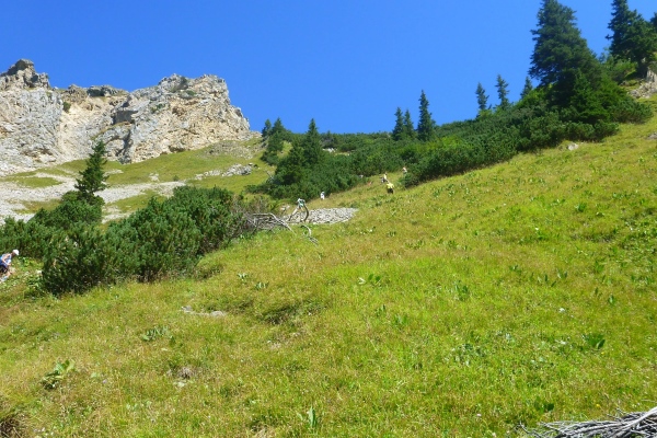 Frisch gestärkt geht es noch kurz durch den großen Ahornboden, bevor wir die nächsten 700 Höhenmeter in Angriff nehmen. Auf einer Forststraße erreichen wir nach 2,5 km die Binsalm (1.502 m). Eine Wandererfamilie diskutiert, ob sie den letzten Bus an der Gramaialm erreichen wird. Wenn die wüssten, was noch kommt! Ein Marschierer überholt uns, von seinem treuen vierbeinigen Freund an der Leine bergauf gezogen.