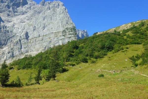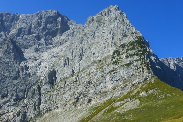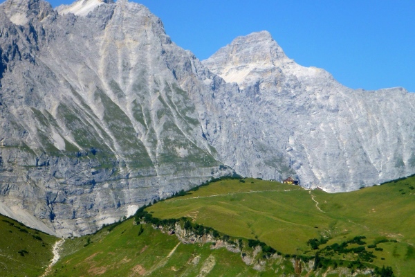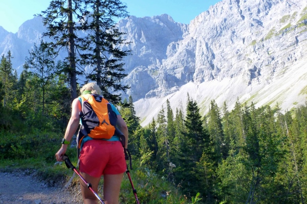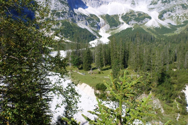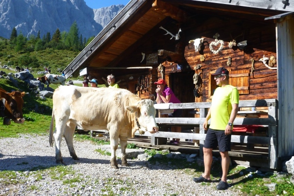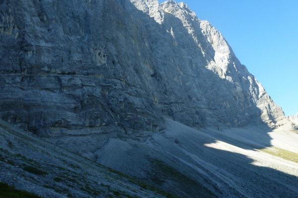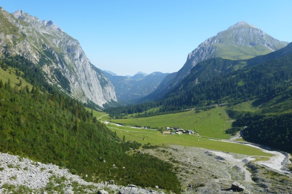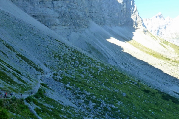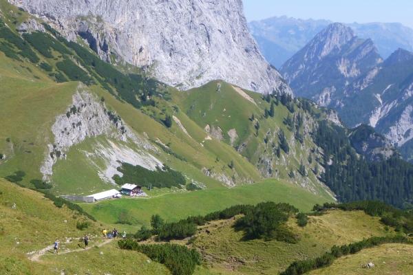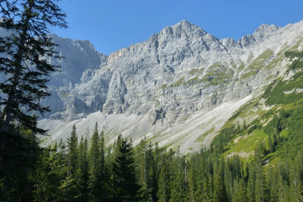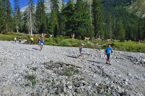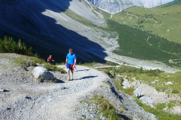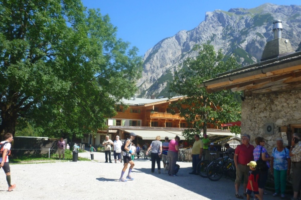 Wie gewohnt erwartet uns auch hier eine perfekte Verpflegung, zur Abwechslung mit Hafersuppe. Gut, dass es viele Bänke zum Ausruhen gibt. Frisch gestärkt laufen wir direkt an den Laliderer Reisen vorbei, hier im Schatten bei angenehmer Temperatur. Mir macht das richtig Spaß, so knapp an einer 1.000 Meter hohen Wand entlang. Genauso schön ist der Blick ins Laliderertal mit seinen Almen. Noch mal ein kleiner Anstieg zum Hohljoch auf 1.750 m. Der zweite Höhepunkt ist abgehakt. Ein Blick zurück gilt der Falkenhütte und der kühlen Laufpassage.