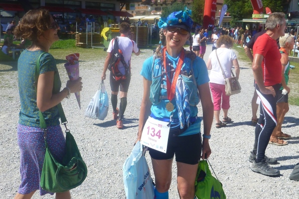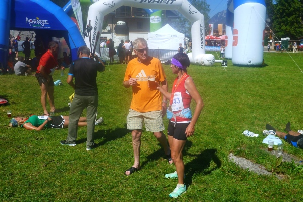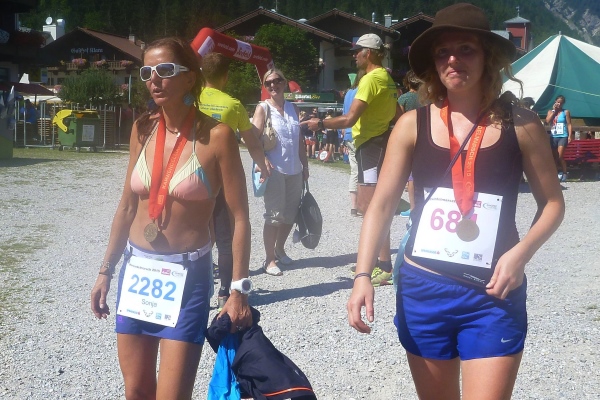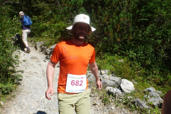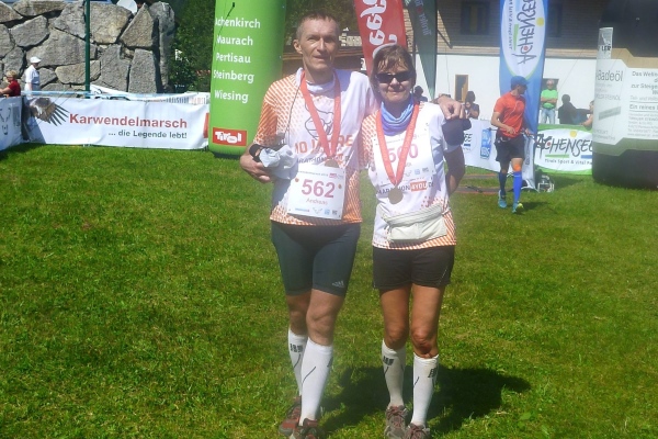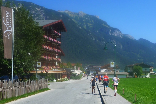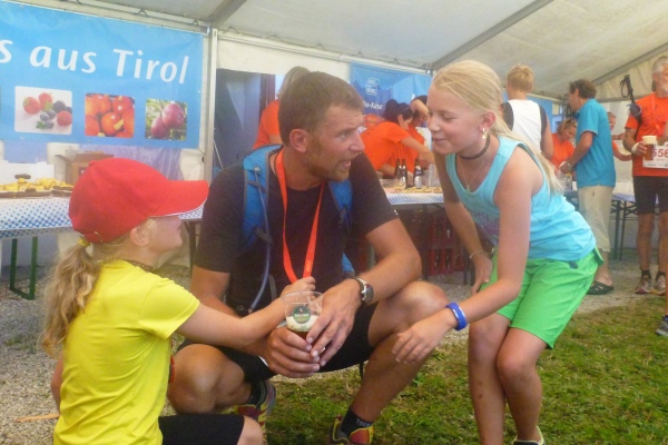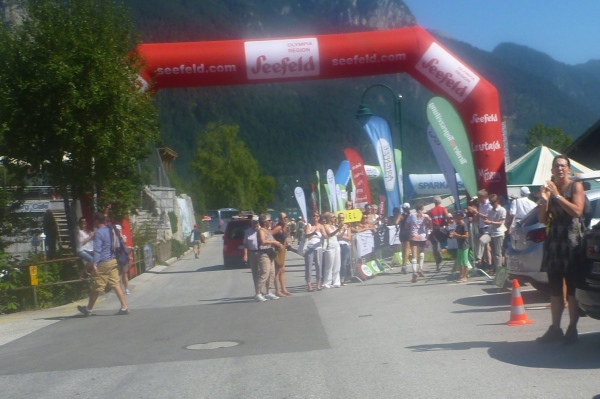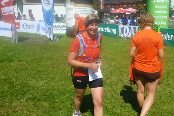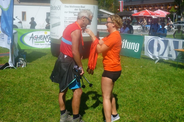 Trotz unseres späten Geschwindigkeitsrauschs freue ich mich auf die letzte Labestelle Falzturnalm. Hier steht sogar eine Flasche Obstler bereit. Ab jetzt laufen wir auf geteertem Radweg durch schönen Mischwald die letzten vier Kilometer ins Ziel. Unser flottes Tempo wird durch die nahezu 300 Höhenmeter begünstigt, die es auf den letzten acht Kilometern bergab geht. Am Dorfrand von Pertisau wartet ein Bogen auf uns, kurz danach kann man in der Ferne schon den Achensee erkennen. „Tirols Sport & Vital Park Achensee“ ist die Zielregion des Laufs. Fast am See, beim historischen Fischergut, empfangen uns auf 932 m viele applaudierende Zuschauer. Nach 8:10 Stunden bekommen wir eine Medaille mit einem glitzernden Bergkristall umgehängt.
