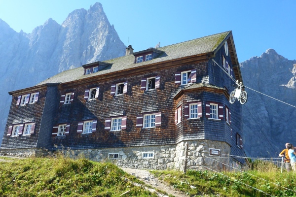 Das nächste Zwischenziel, die Falkenhütte (1.848 m), gerät vor uns ins Blickfeld. Ein in der Luft schwebendes Fahrrad soll vermutlich andeuten, dass auch Mountainbiker hier gern gesehen sind. In der Folge werden wir einige schnaufende und bergauf strampelnde Vertreter dieser Spezies zu Gesicht bekommen. Der Weg ist breit, sie sind langsam, weshalb für beide Seiten keine Gefahr besteht.