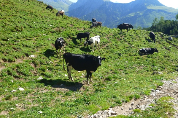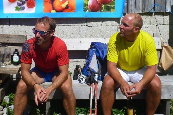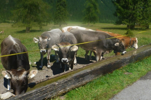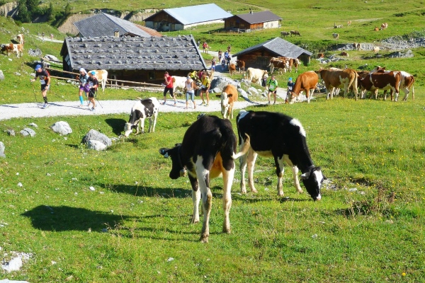Die Hälfte der Wegstrecke ist erreicht. In Sachen Höhenunterschiede haben wir allerdings noch Nachholbedarf und müssen jetzt die nächsten 500 Höhenmeter zur Falkenhütte in Angriff nehmen. Aufheiterung verspricht die Ladiz-Alpe mit jeder Menge Fleckvieh samt Kälbern. Besonders die Mädels zücken hier die Foto-Handys. Es scheinen viele Städter unter den Teilnehmern zu sein. Rechts steht eine riesige Wand, die Ladizer Reisen. Bis auf 2.700 Meter türmen sich dahinter die Bergspitzen. Wir verlassen den steilen Fahrweg und begeben uns auf einen schweißtreibenden Pfad durch die Wiese. Auf den Fotos sieht das so harmlos aus. Die ersten Mitstreiter legen ein Päuschen am Wegrand ein.