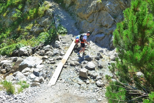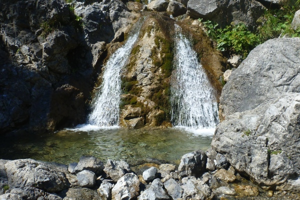 Ein Läufer, den ich überhole, ruft mir zu, dass der Weg nun schön steil bergab geht. Da hat er nur zu Recht. Zwei Mädels überholen uns, schlittern den sandigen Weg hinab, jauchzen vor Freude und reißen zwei Jungs vor ihnen noch mit. So kann man auch Kontakte knüpfen. Judith und ich sind da wesentlich vorsichtiger. Dann zeigen uns die geübten Bergläufer und Marschierer, wie es richtig geht. Sie lassen uns weit hinter sich. Wenigstens sind wir bald im Wald und es wird etwas kühler. An einem kleinen Wasserfall hat sich eine Badegumpe gebildet, die ziemlich einladend wirkt.