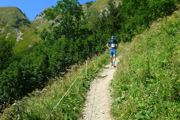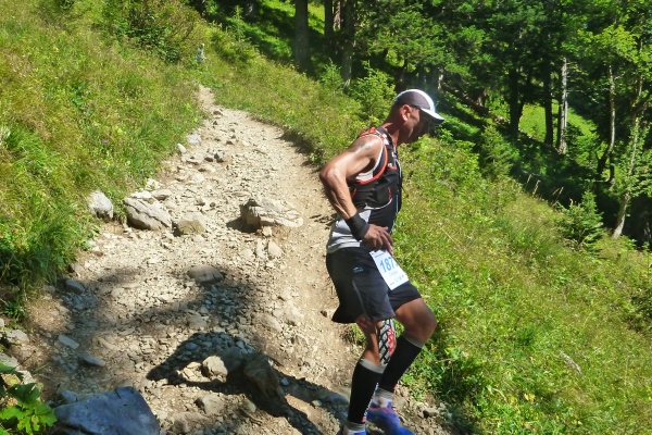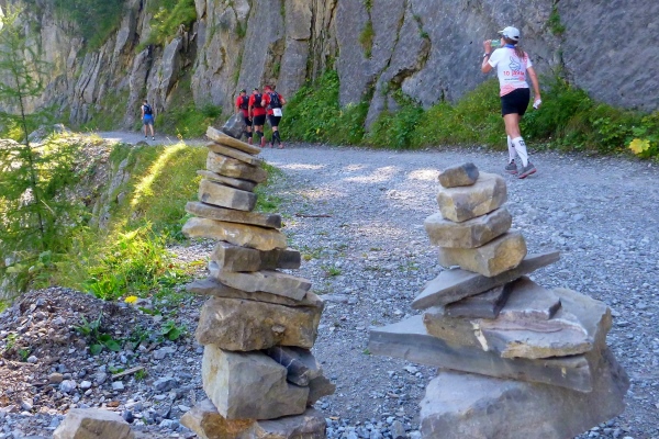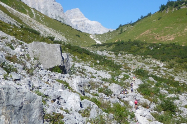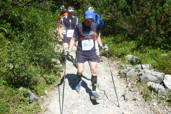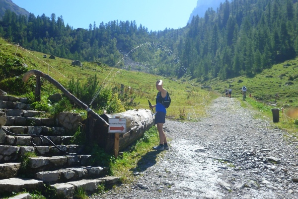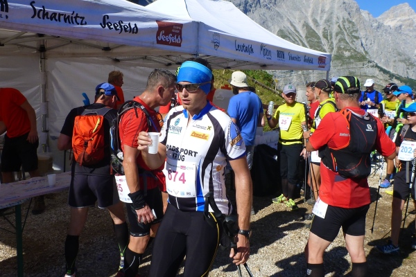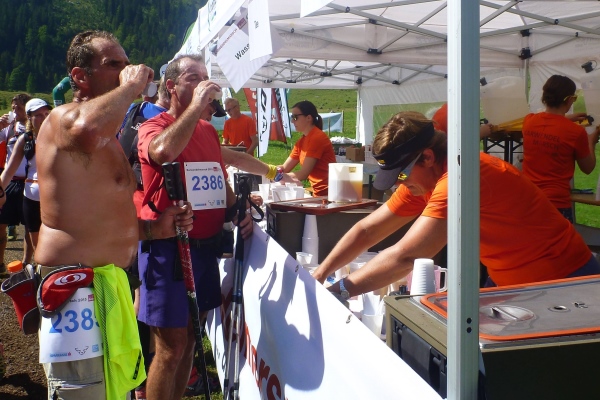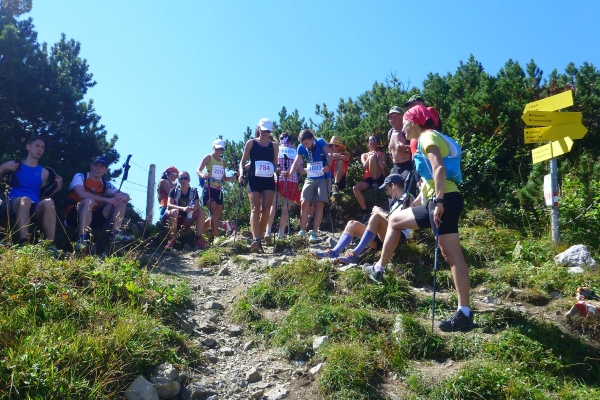 Die Binsalm erwartet uns mit der nächsten Komplettverpflegung. Auch ein Bierchen gäbe es dort, jedoch mit Alkohol. Dort könnte man auch im Vorbeigehen eine kurze „Dusche“ nehmen. 200 Meter weiter oben sieht man vor dem Binssattel eine Serpentinenkette von Läufern. Auf schönem Wanderpfad geht es weiter steil nach oben. Kennt ihr diesen tollen Geruch von Latschenkiefern in der sengenden Sonne? Viele müde Kämpfer sitzen am Wegrand. Mir kommt es vor, als hätte ich seit Stunden nichts getrunken. Ich bin völlig am Ende. Mein Puls passt sich meiner fast kriechenden Fortbewegung an und sackt nach unten. Gut, dass Judith noch ein Magnesiumtütchen für mich hat. Und etwas zu trinken aus ihrer Iso-Backup-Flasche. Dann zieht sie davon.