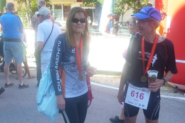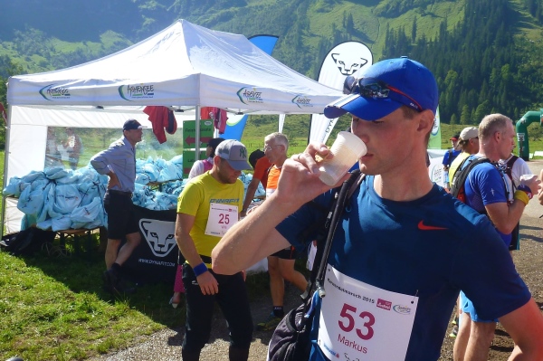 Wir halten uns erst mal an die leiblichen Genüsse. Das alkoholfreie Bier aus München schmeckt wunderbar. Ich gestehe, dass ich zwei Liter davon trinke und dann noch jede Menge Holundersaft. Unglaublich, welchen Flüssigkeitsbedarf ich in den nächsten Stunden noch decken muss. Und Wurst- und Käsebrote verdrücke ich zusätzlich. Kekse, Obst und die schon erwähnten Wanderriegel sind weitere Optionen bei der Zielverpflegung.