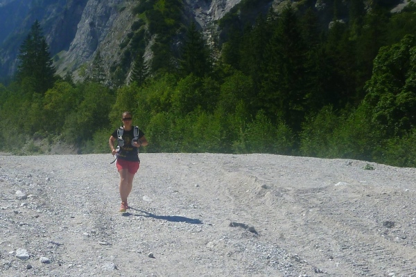 Abwechslungsreich geht es durch ausgetrocknete Bergbäche, Wiesen und Wäldchen. Judith und ich rasen nur so dahin. Die letzten zehn Kilometer bei unserem ersten Ultra hatte ich mir eigentlich ganz anders vorgestellt. Läufer um Läufer wird eingesammelt, manch „alter Bekannter“ wird überholt, auch der Mann mit Hund hat keine Chance.