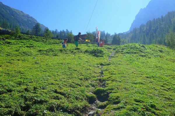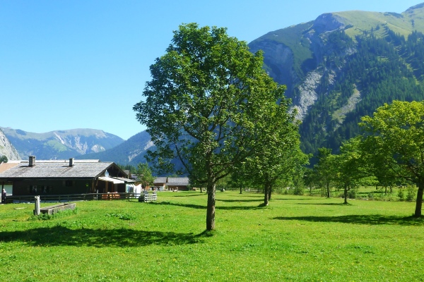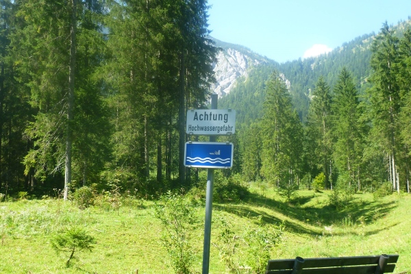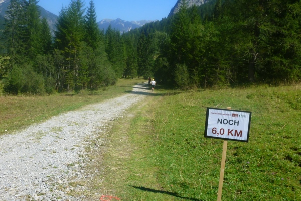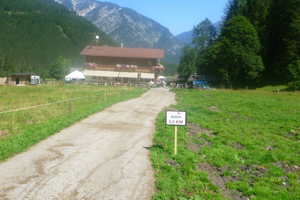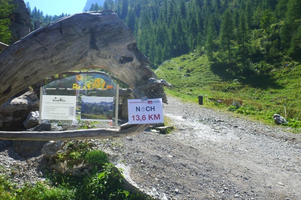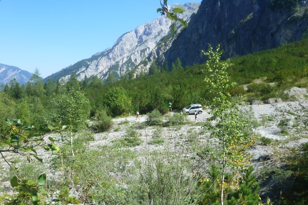 Ein Auto der Bergwacht kündigt den Übergang in eine Forststraße im Gramaier Grund an. Die verbleibenden Kilometer können wir nun regelmäßig von Schildern am Wegrand ablesen. Das breite Falzturntal wird von Pertisau her durch eine Mautstraße erschlossen, weshalb uns die Gramaialm nicht nur mit einer Labestelle, sondern auch mit einem großen Parkplatz und vielen Reisebussen samt spazierfreudigen Senioren empfängt. Um mit der motorisierten Zivilisation nicht so schnell in Kontakt zu kommen, halten wir uns auf einem Weg am rechten Talgrund.